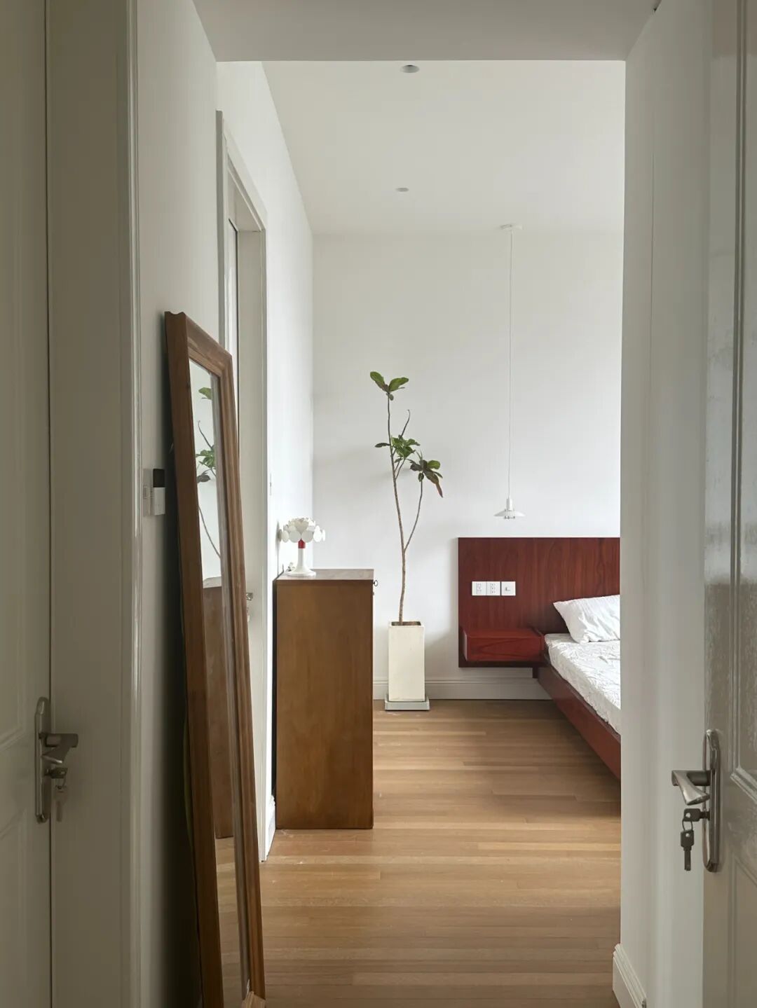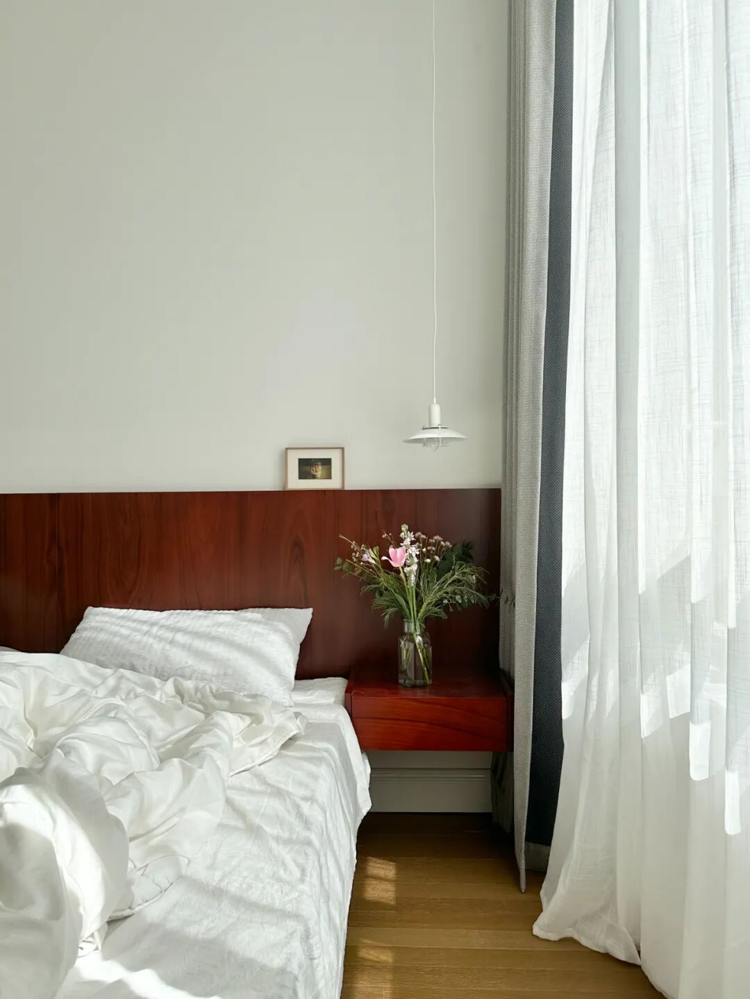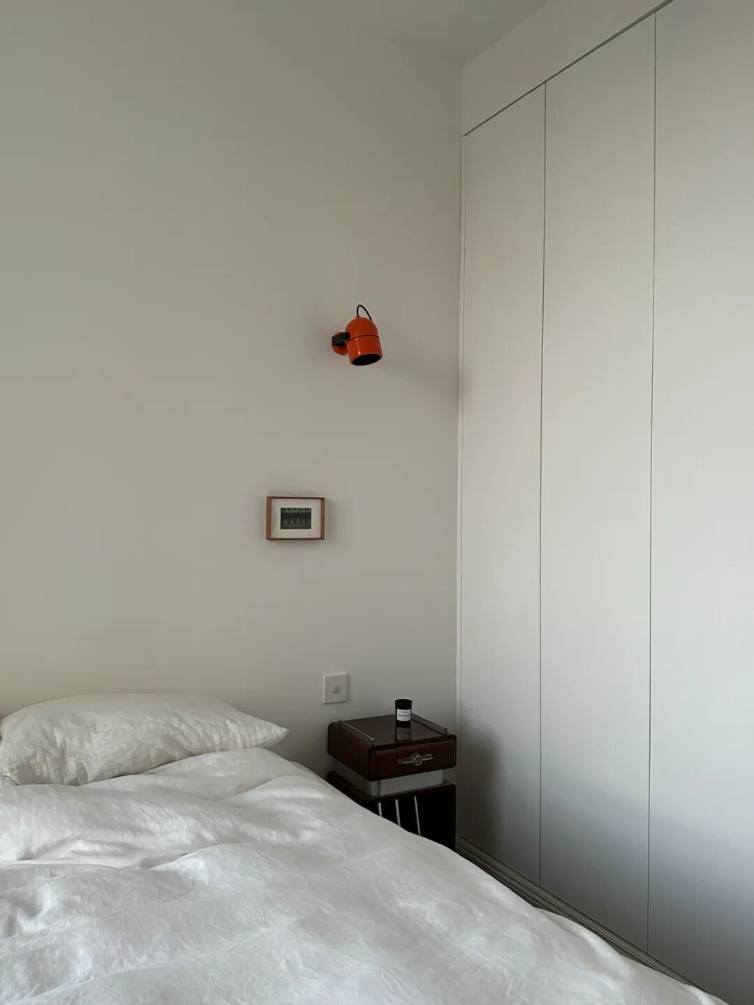 主卧的床是自己找师傅定制的,模仿了一款中古床,床头有一个小抽屉。睡眠的空间不需要太复杂,让我心安就足够了。
