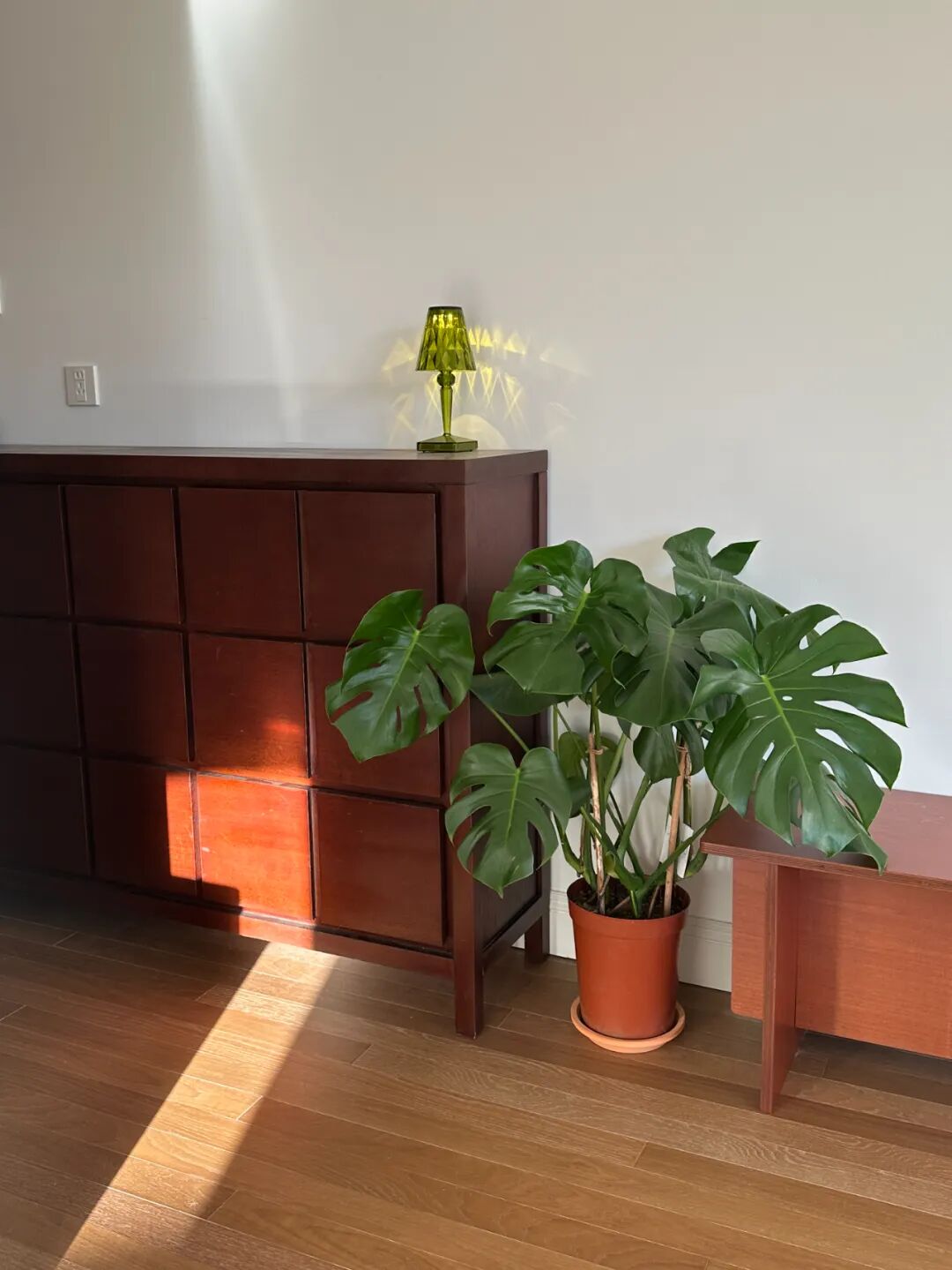 再点缀一棵绿植,便是玄关的全部了,它简洁、又有巨大的收纳空间,深木色的换鞋凳带来了一丝中古感。