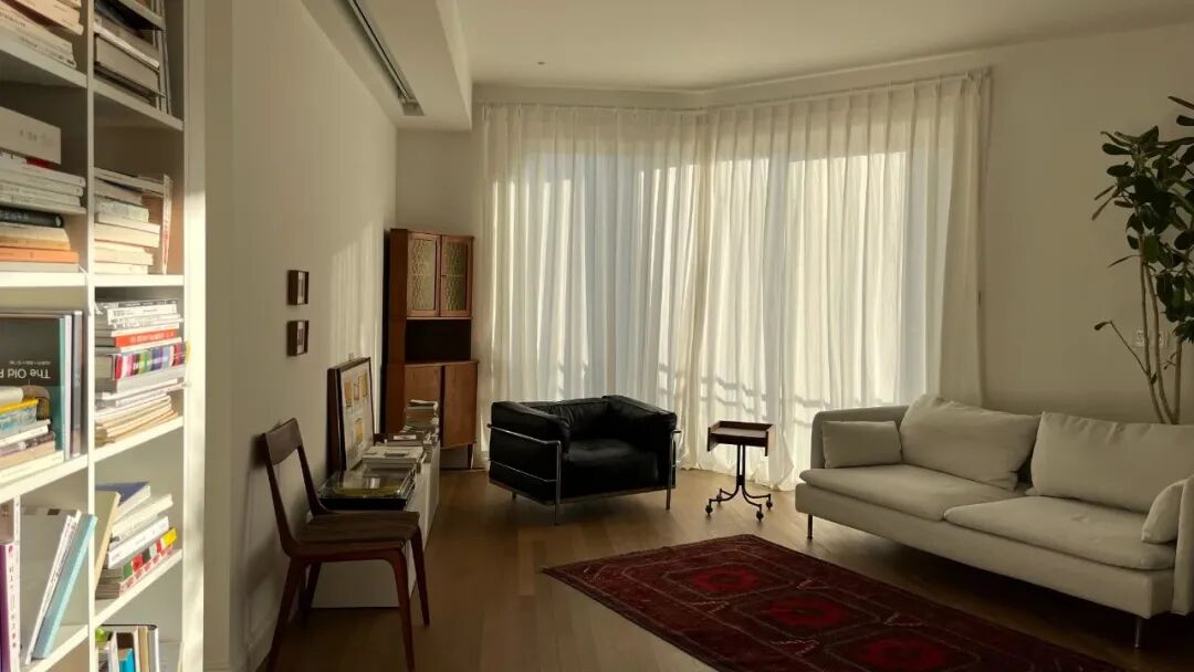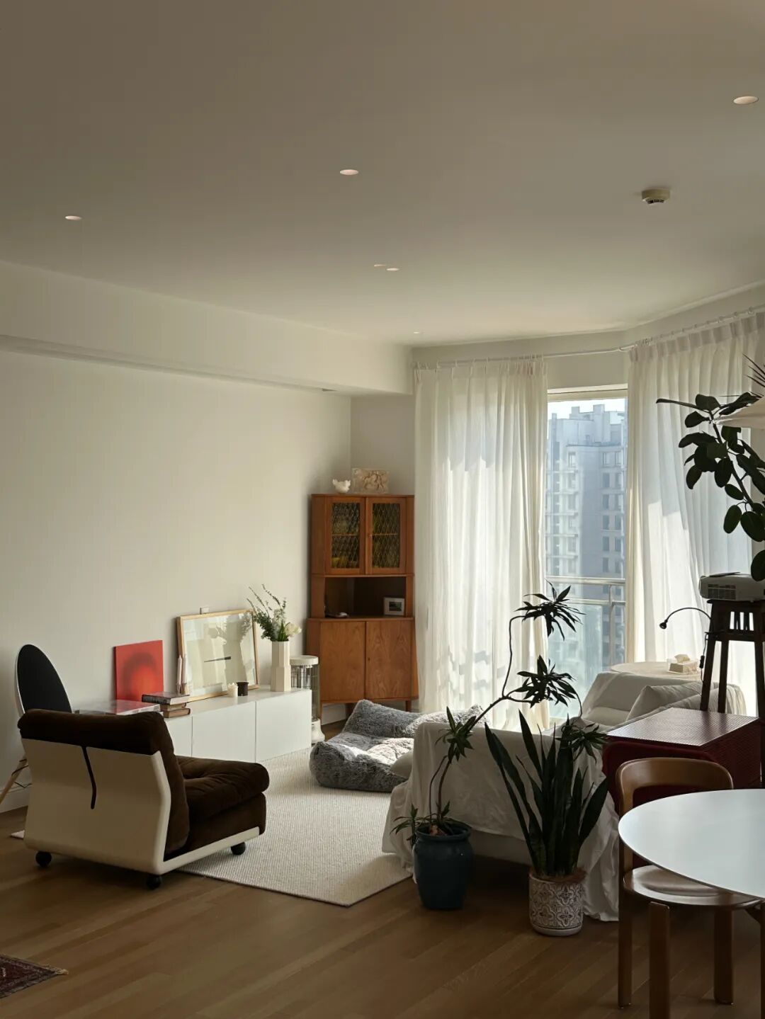 客厅简单随性,一面白墙留着看投影仪,有宜家的沙发、也有淘来的Cassina LC3单人沙发,我很喜欢“宜家+中古”搭配出来的层次感。