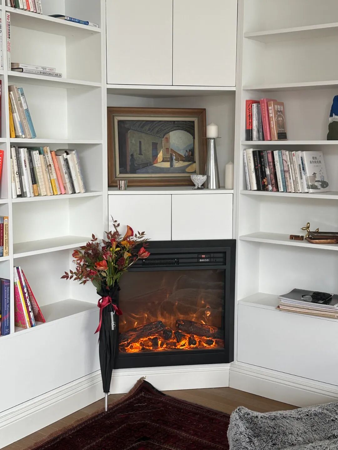 客厅的另一头做了一面转角书墙,这些年跟着我的书终于有了自己的家。中间还内嵌了一个壁炉,是真的可以取暖的电壁炉。