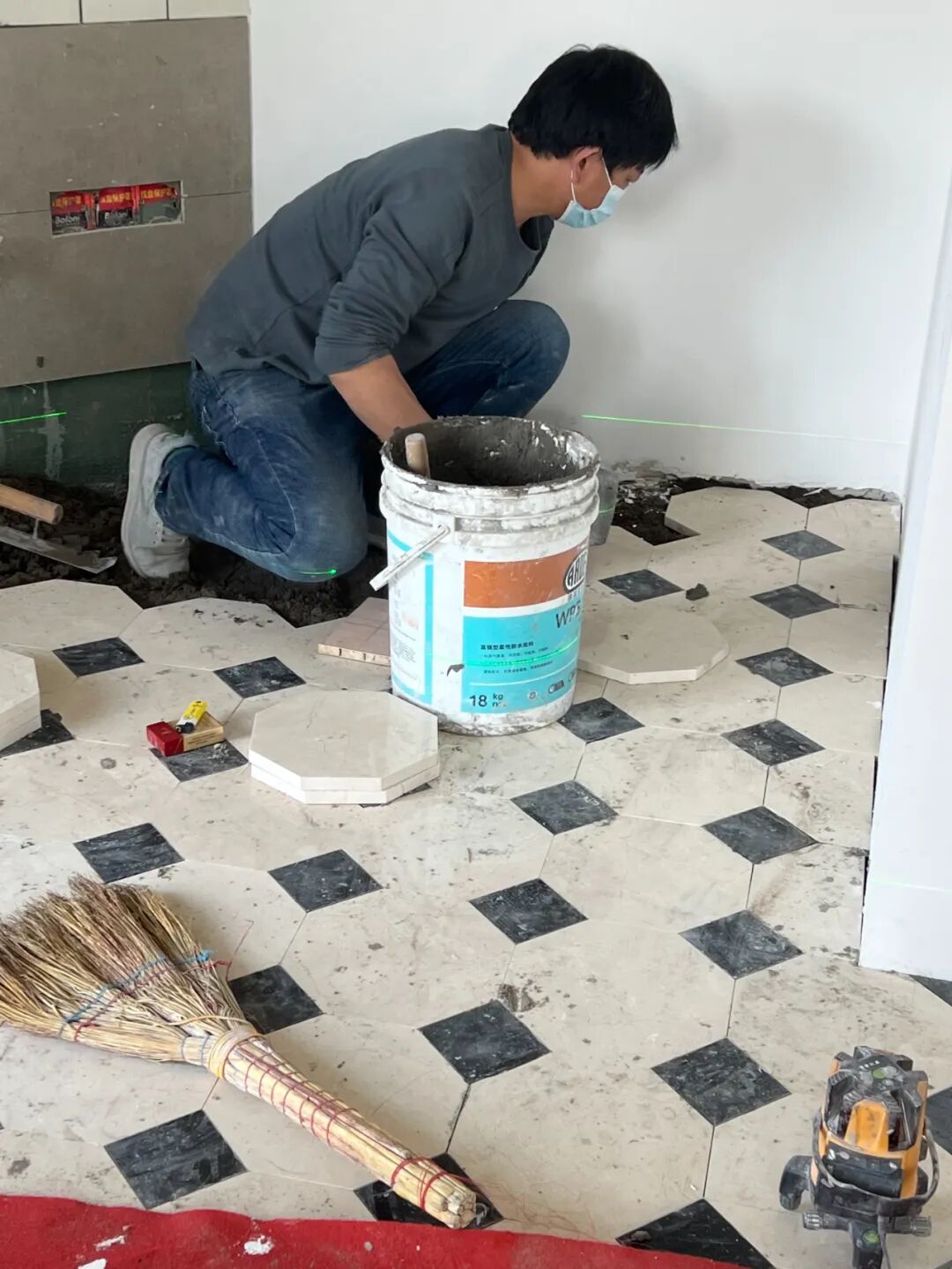 终于!遇到一家超细心的店,因为异形的厨房不好测量,老板来现场整整量了半小时,用到了水波雕花的工艺,最后安上去是严丝合缝的,造价有点小贵,这一片地砖就花了一万,但我真的很满意。