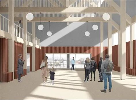 传统的石灰石与穿孔木材和裸露的混凝土门楣相结合形成了一种独有的材料语言。社区广场给人们提供了在码头栖身和逗留的空间,而在尽头的熟悉的乌鸦山墙(阶梯式山墙)则保留了地方精神。