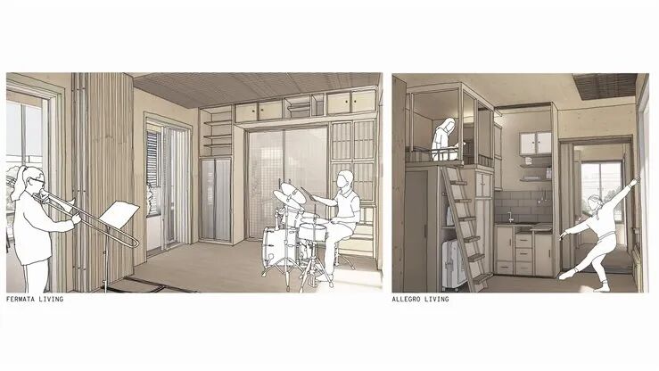 为了适应不同的居住要求,住宅分为两种居住类型——用于巡回表演者的Allegro living,和为永久居住者Fermata living。Fermata living中均配有练习舱,而微型公寓中则有可调整的家具供艺术家练习使用。
