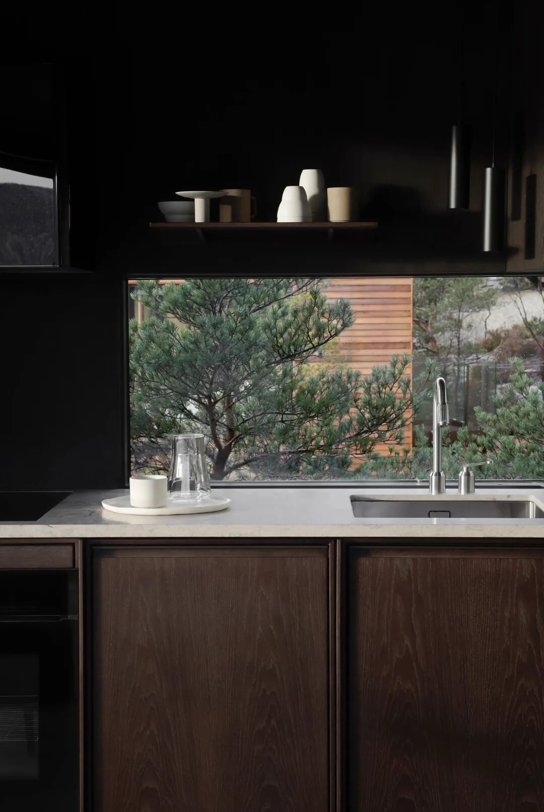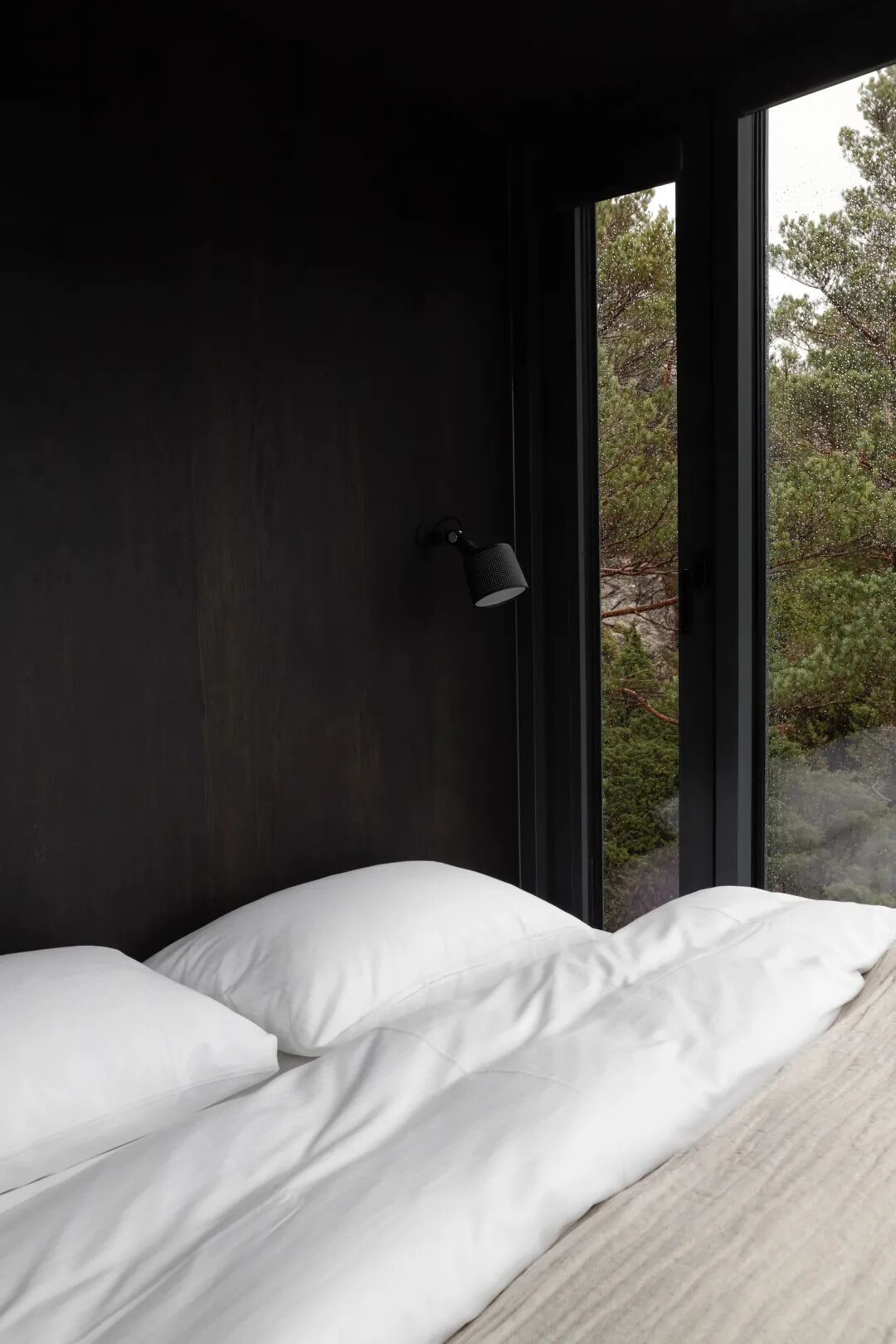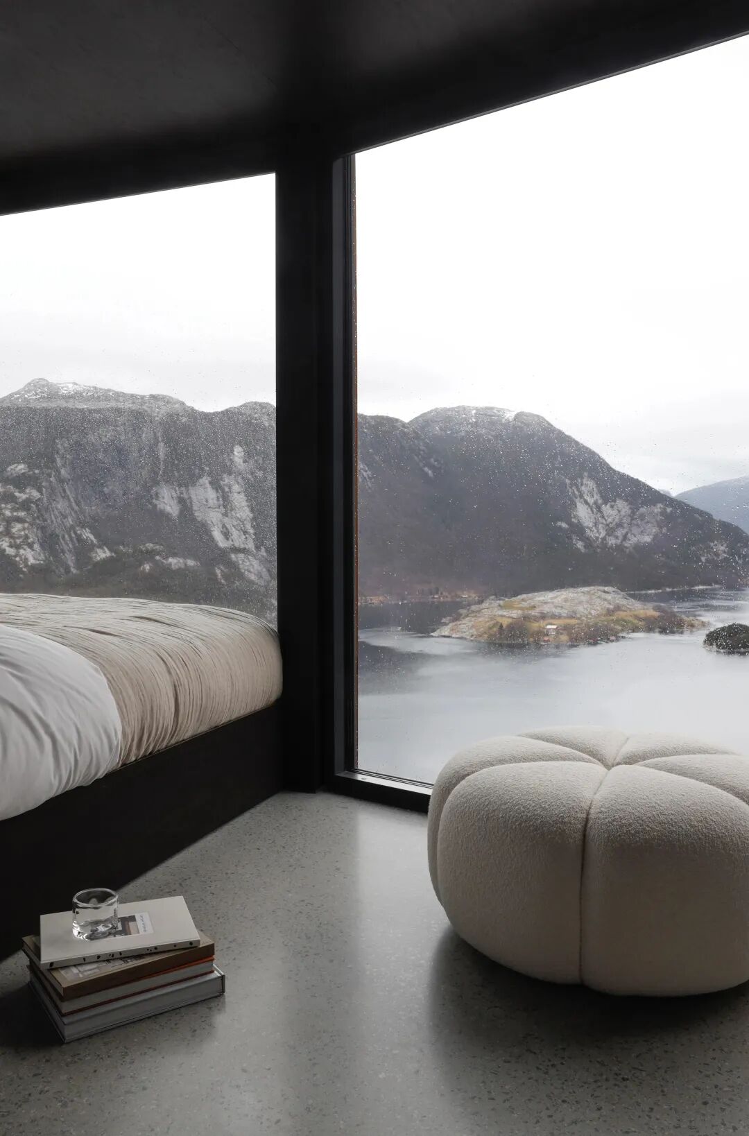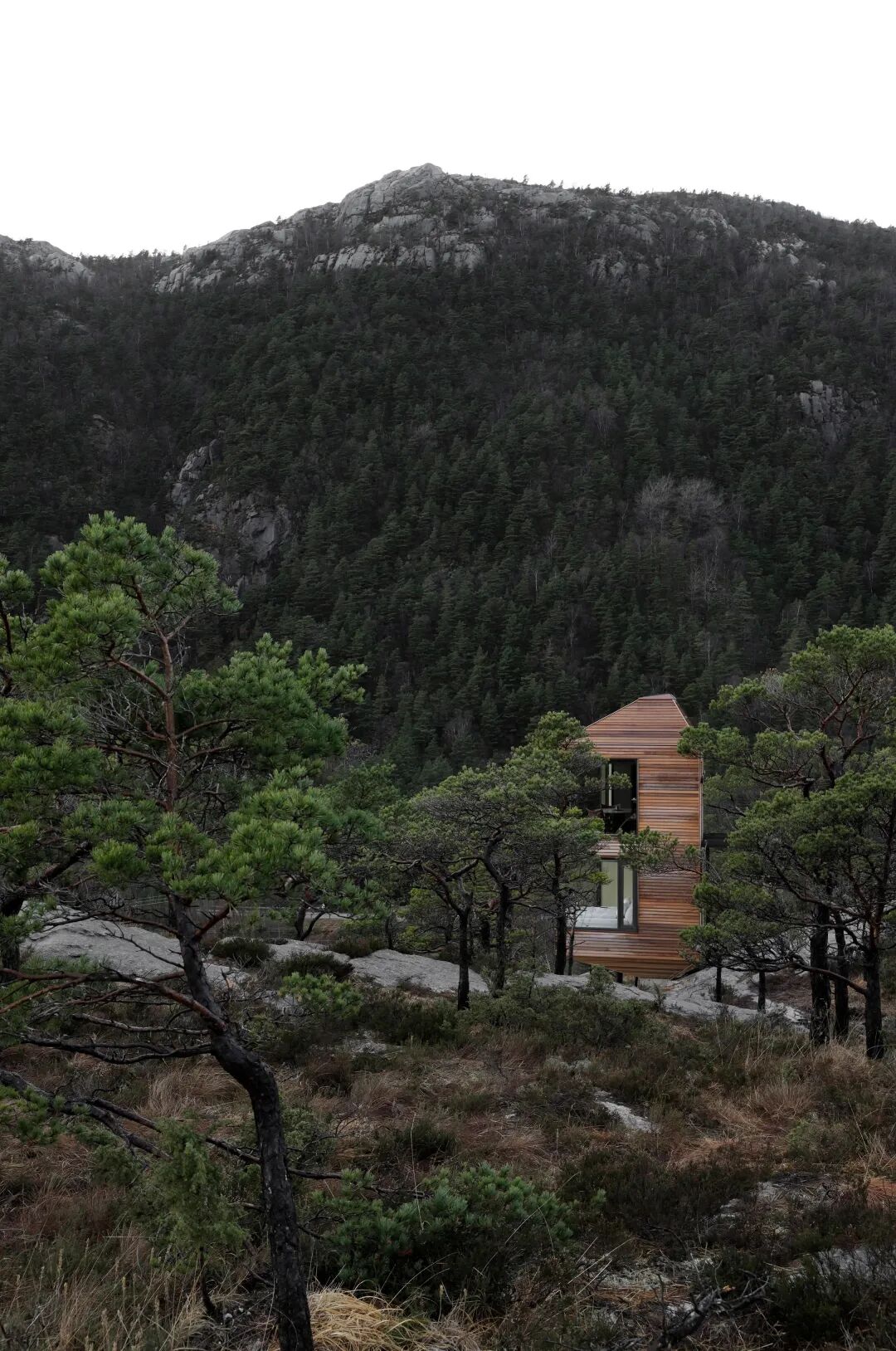 内部和外部的墙壁以及屋顶都合并成一个统一的形状。让物体在景观中是单一的,在内部是同质的。这给小木屋一种轻薄和坚固的感觉,在许多方面就像一个巢穴。内部的细节是极少且精确,以确保在干净的表面上获得完整的体验,而不会干扰壮观的景色。