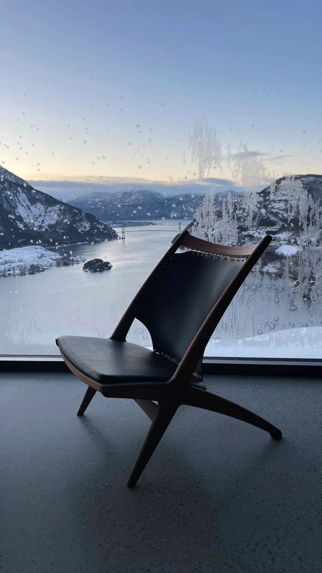 屋顶的底面是镜面的,创造了一个脱离地面的物体——悬停在边缘之上。顶灯的形状在尺寸和位置上与混凝土底座相同。不对称地放置创造了小木屋向峡湾倾斜的错觉,加强了失重的感觉。