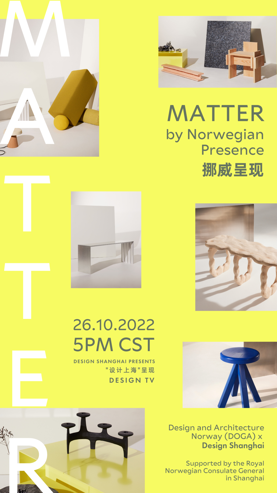 北京时间2022年10月26日下午5点,敬请锁定“设计上海”微信视频号(ID: Design Shanghai),观看“设计上海呈现”特别线上活动——“挪威呈现”(MATTER by Norwegian Presence )。我们与你不见不散!