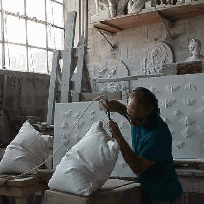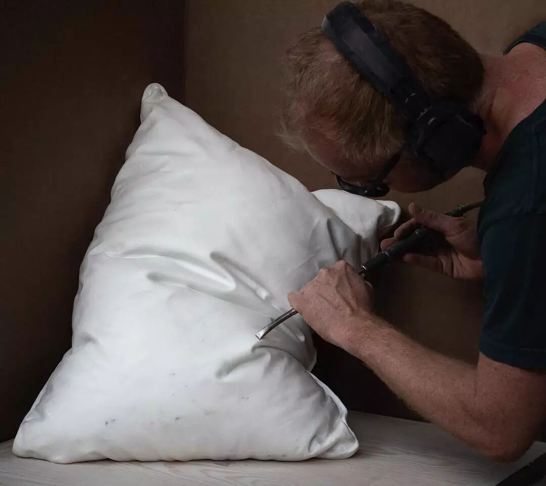 影片显示,Håkon Anton Fagerås戴着保护眼睛、耳朵的护具,并手持电动工具对白色大理石进行雕刻。期间,可见白色粉尘不断飘出,但同时也能明显看到,在他的巧手之下,枕头的皱摺纹路也完美呈现,看起来就像是个蓬松的枕头。