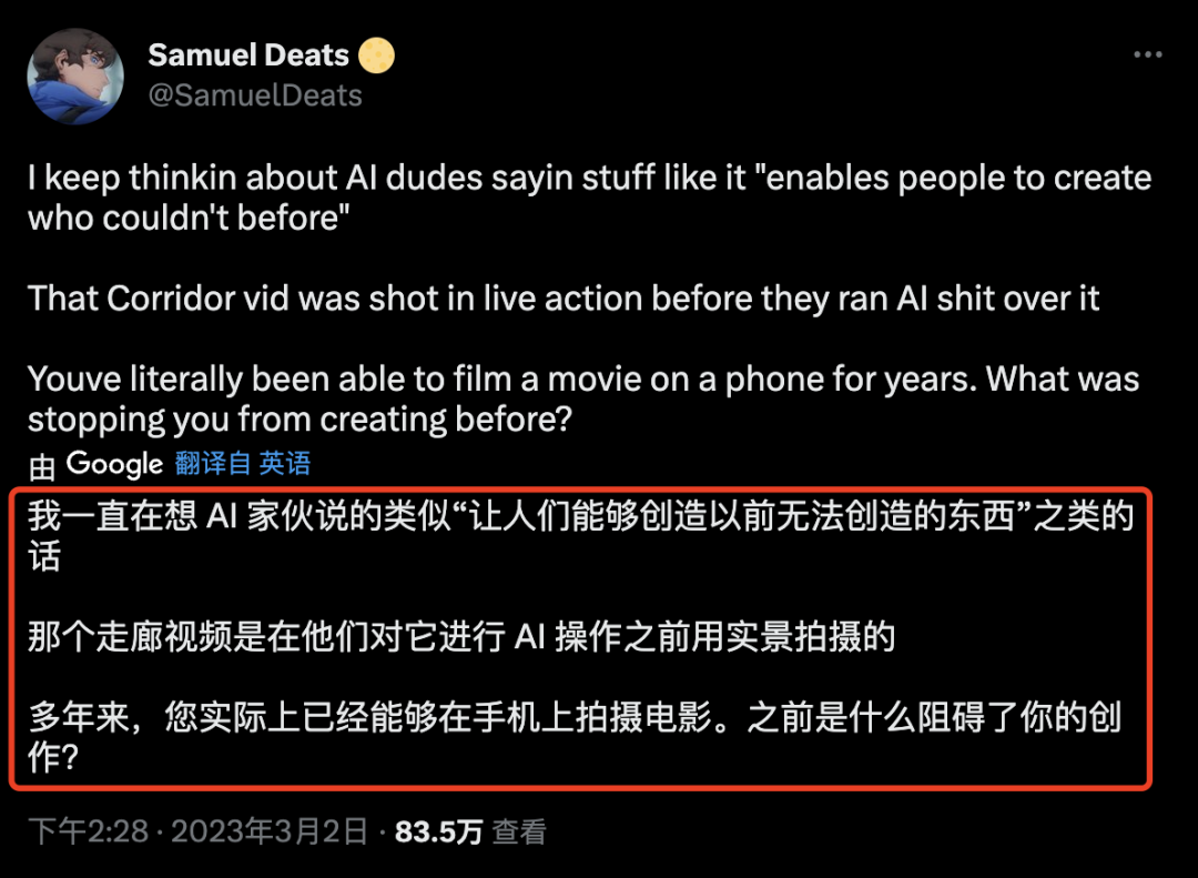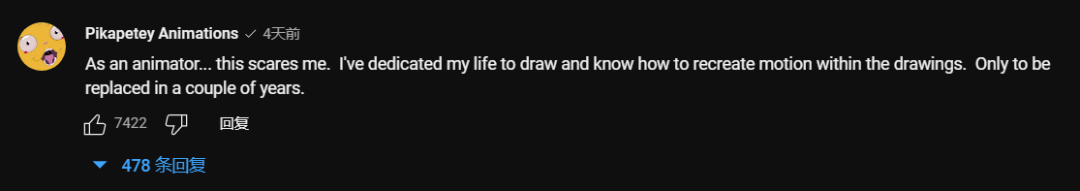 作为一个动画师......这让我感到害怕。我一生都在画画,知道如何在画中重现运动,只是,在几年后,这会被取代。