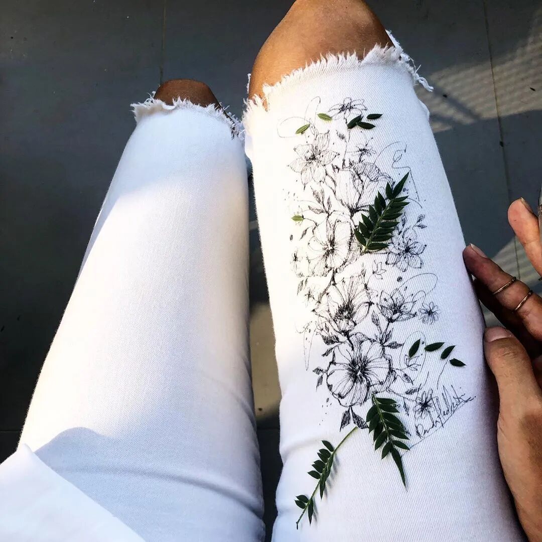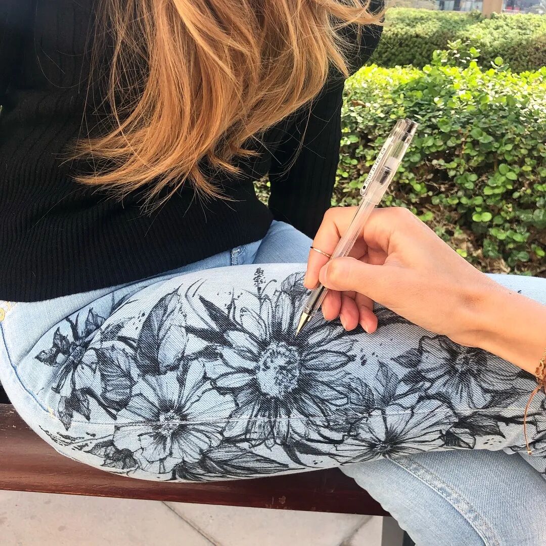 这堪比纹身般的一次性绘画效果 也让越来越多的人愿意做她绘画的模特 她也很享受这样锻炼画技的机会 后来她在人的身体上作画后 觉得挑战程度不高了 又突发奇想的在裤子上作画