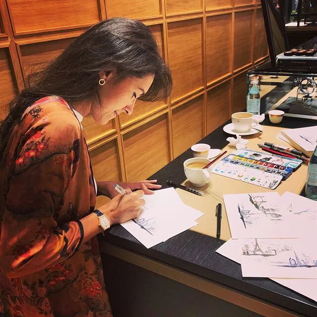 她绘画的素材大多来自于生活中 比如人物、建筑、风景、花卉 她经常随手拿着一支笔就在街上写生 经常引起路人的围观 出去旅游的时候也是她创作的绝佳素材来源 还就地取材的创作