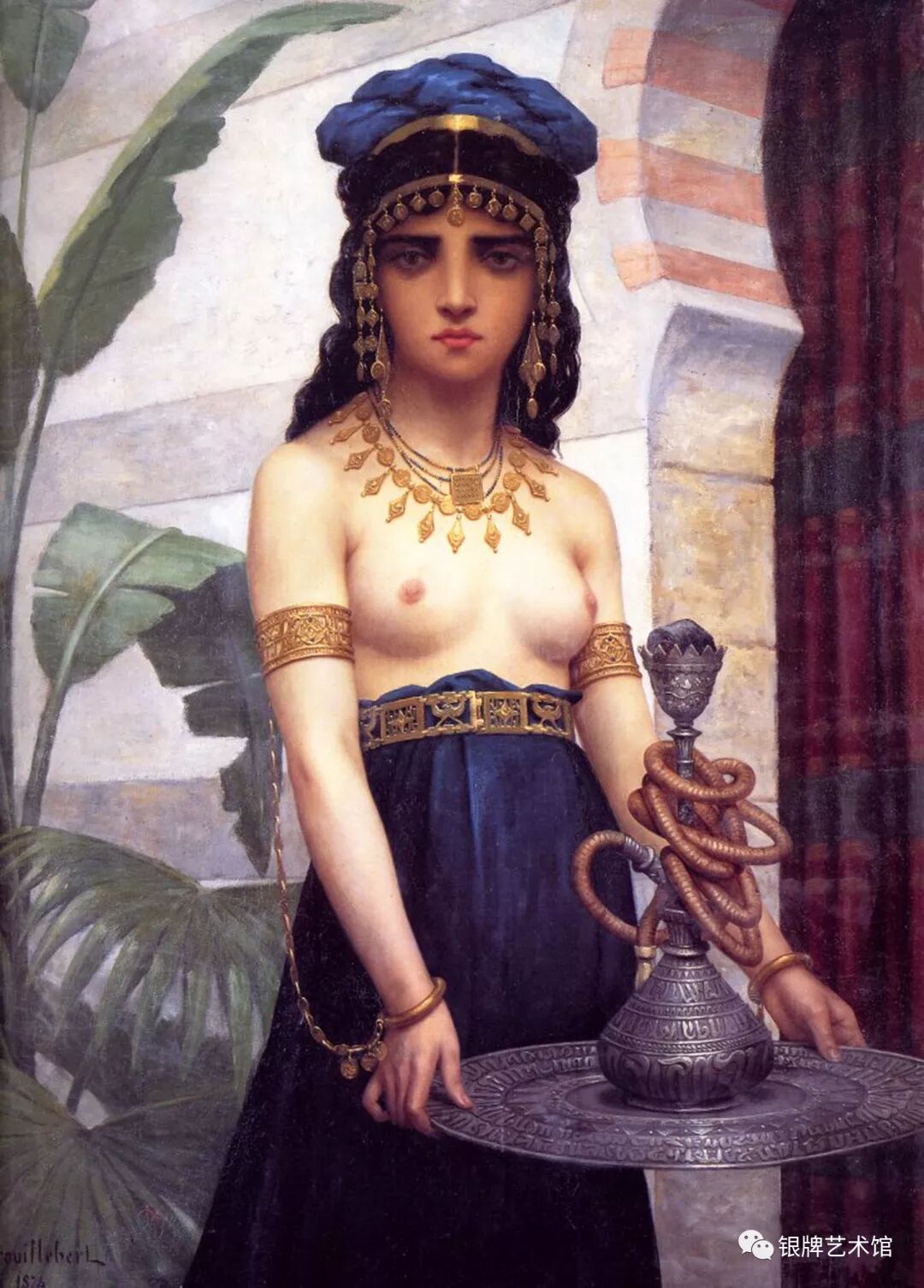 画家通过对一个东方女仆及其环境的简洁表现,展示了令人神往的东方情调;女仆裸露著丰满的上身,身姿纤细,脖颈的颈项饰物和臂饰、手饰、腰饰,这些装饰物形成了统一对称的和谐美感 ,服装极富阿拉伯风格,端庄的面容略带阿拉伯女性特有的忧郁,同时画家又以精微的笔法刻画了女仆手中的水烟具,极富质量感。
