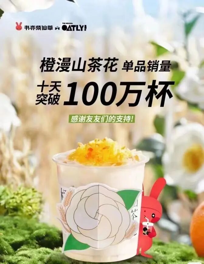 今年3月末,OATLY与书亦烧仙草合作推出了一款别具一格的植物基新茶饮——“橙漫山茶花”,上市仅仅10天,单品销量就惊人地突破了100万杯的好成绩,由西式“咖啡伴侣”切换为中式“茶饮伴侣”的操作,明显让燕麦奶极强的可塑性和通用性再次被市场看见,也打破了燕麦奶在中国市场作为咖啡圈“标配”的固定印象。OATLY亚洲区总裁David Zhang似乎对这样的好成绩并不意外,这也是OATLY燕麦奶在品类与场景应用上的全新阶段。