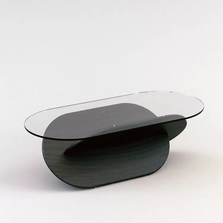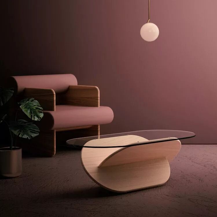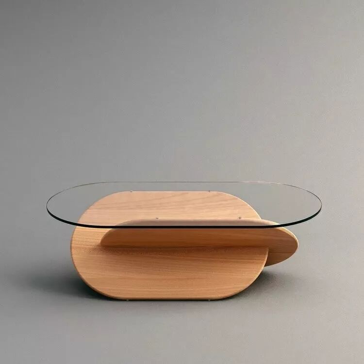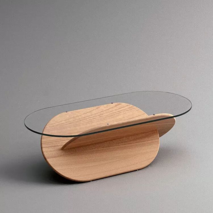 Aero 咖啡桌的底座是两个交叉的木件。,搭配上方的玻璃桌面,十分轻盈。