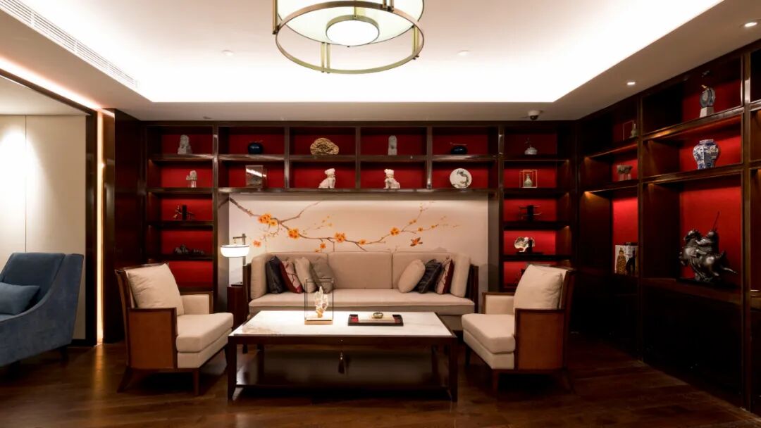 图书管旁的水吧,背墙延续整体风格,同样的顶天立地的巨型书柜,搭配宋风古画,高挑的吧椅,点缀中国红,京味古韵在此刻灵活了起来。