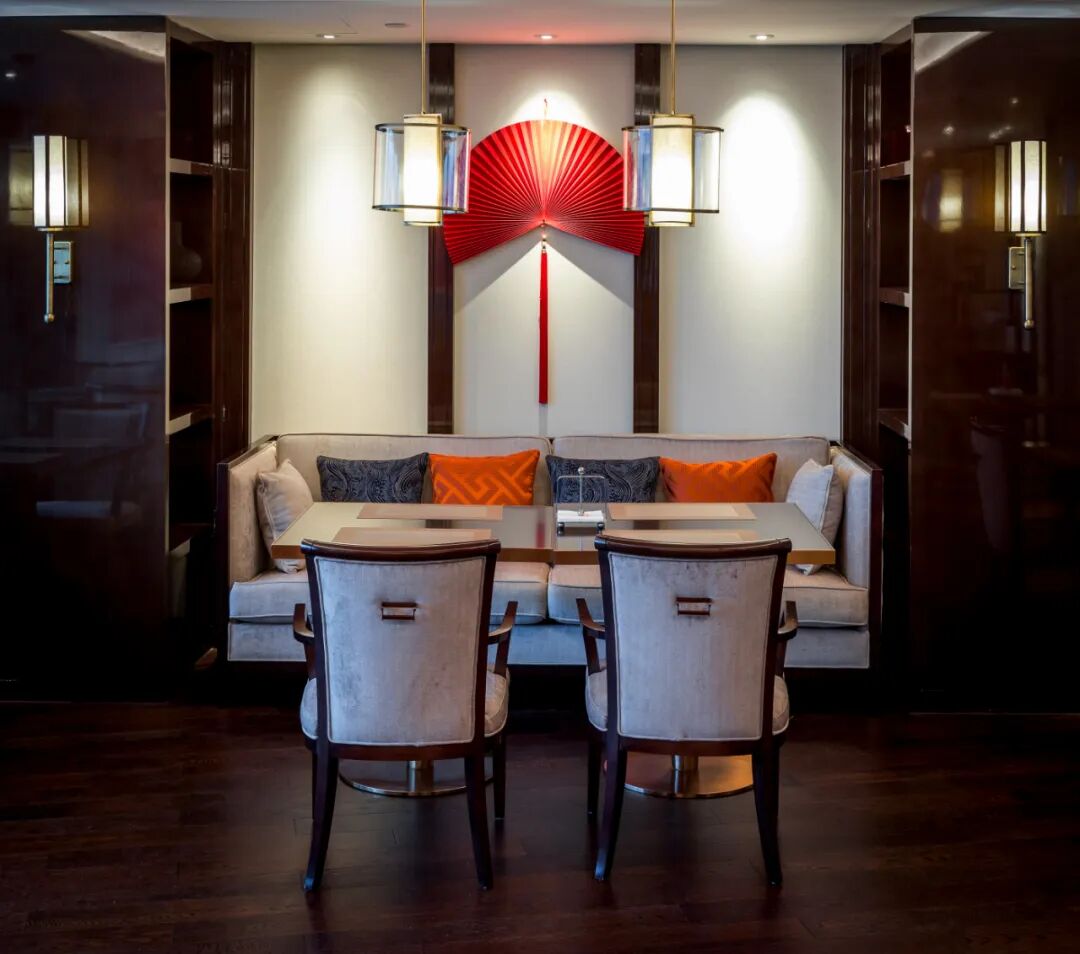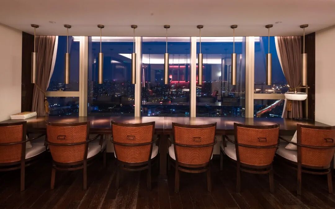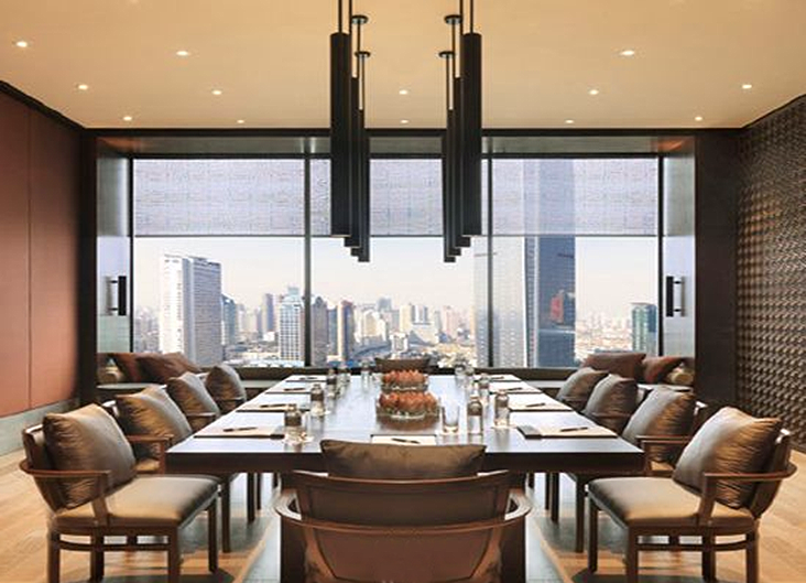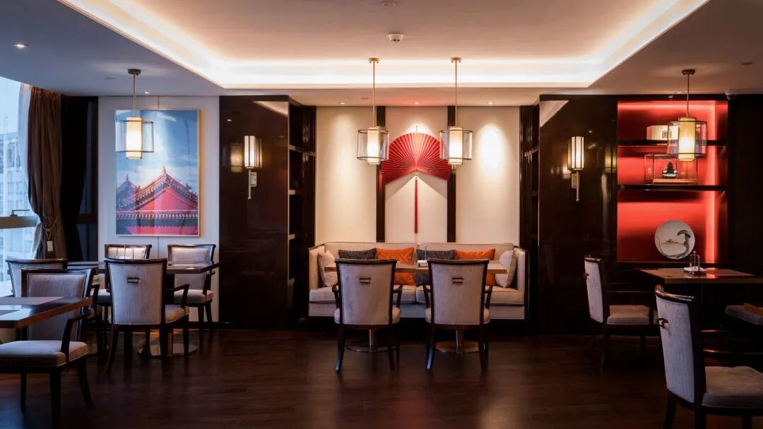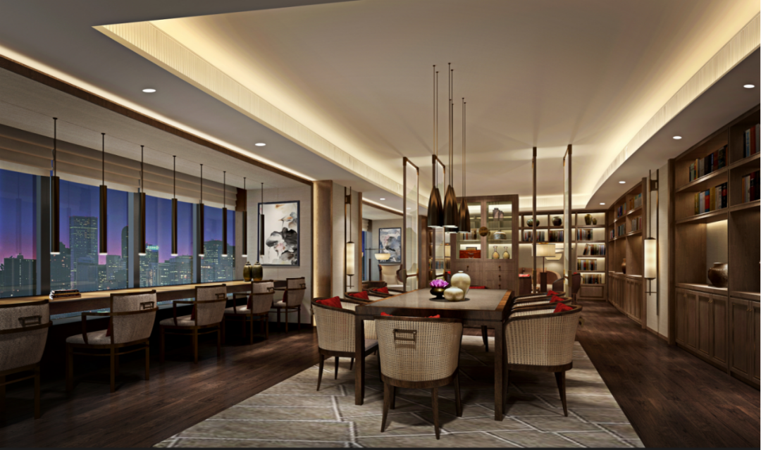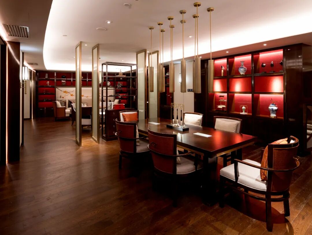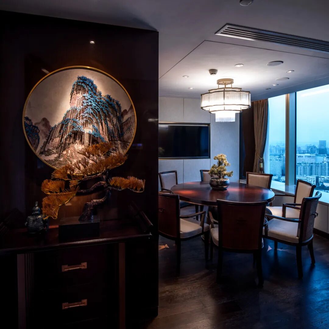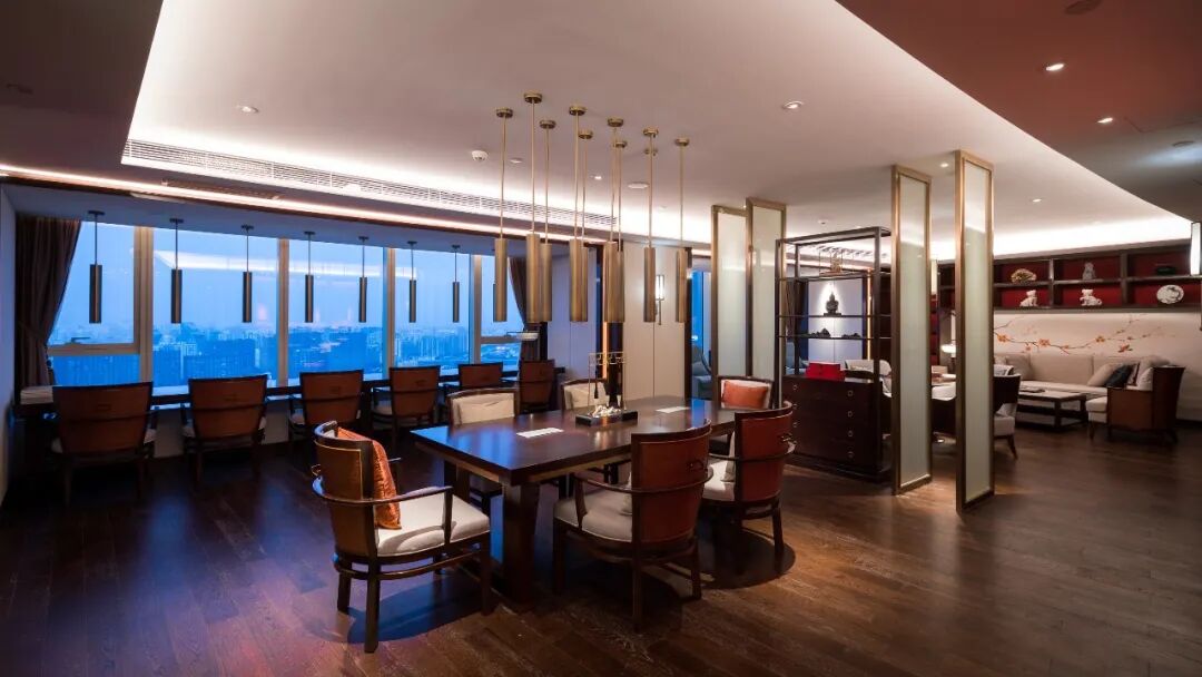 F35层,是早餐厅/咖啡厅,中式高雅在这里显得尤其雅致大方,OE设计师运用大量的木饰,将空间打造成气质与质感并存的用餐空间,少许的中国红作为点缀亮点,韵味十足。