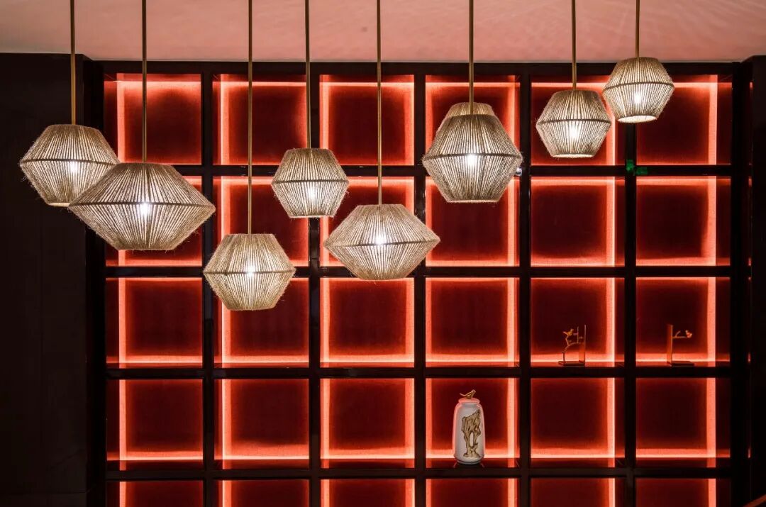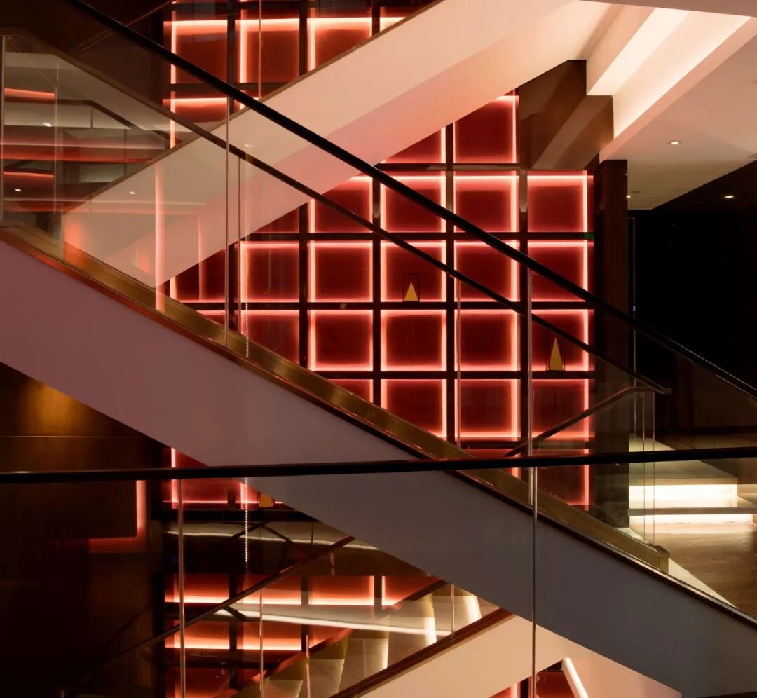 为了呼应北京城“琉璃”“红墙”的元素,OE设计师,打造了一面原创展示墙,楼梯转角,尽显皇城的讲究与精致,红光与高阁相交,迸发出醉人的高级感,格中点点装饰,让人感受扑面而来的电影感,未完待续的故事,等待客人的谱写。