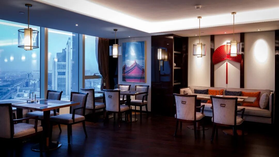 F35 floor, is the morning restaurant/coffee shop, Chinese elegance is particularly elegant and generous here, OE designers use a lot of wood ornaments, the space into the coexistence of temperament and texture of the dining space, a little Chinese red as the ornament of highlights, full of charm.