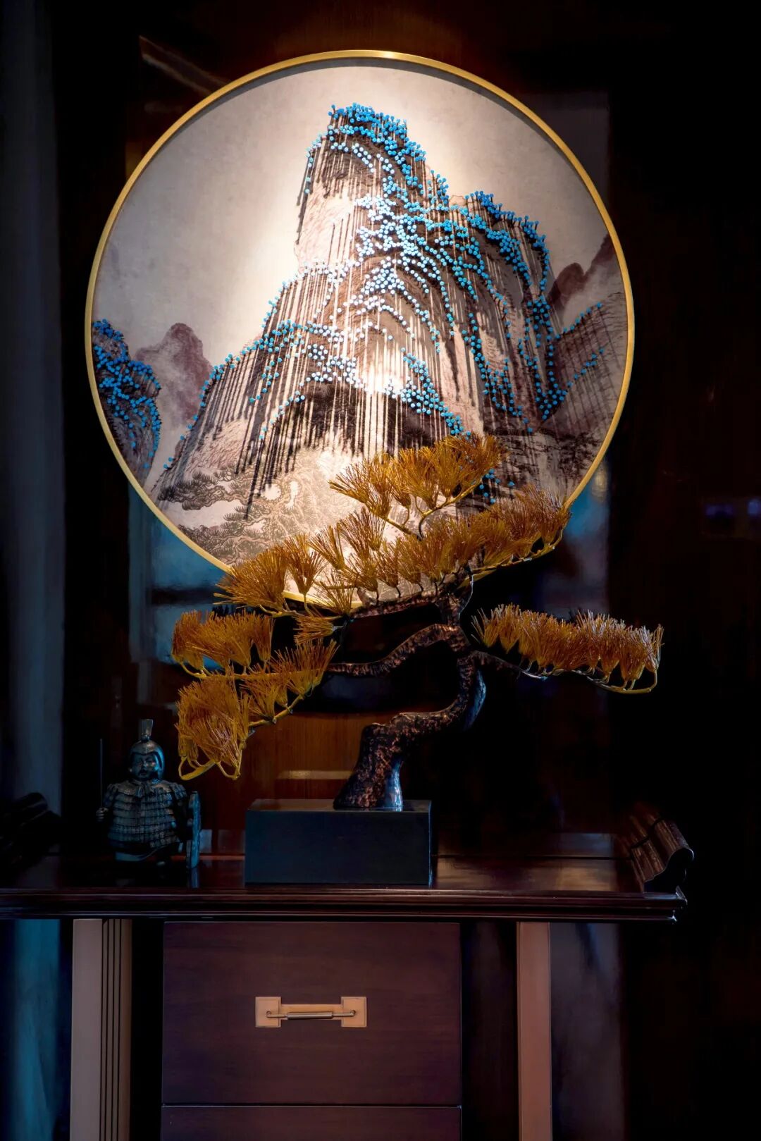 越过一个极具故事感的玄关,光影扫过纯手工打造的宋风青绿山水画,透过前景翠绿的迎客松,古典的中式氛围感拉满。