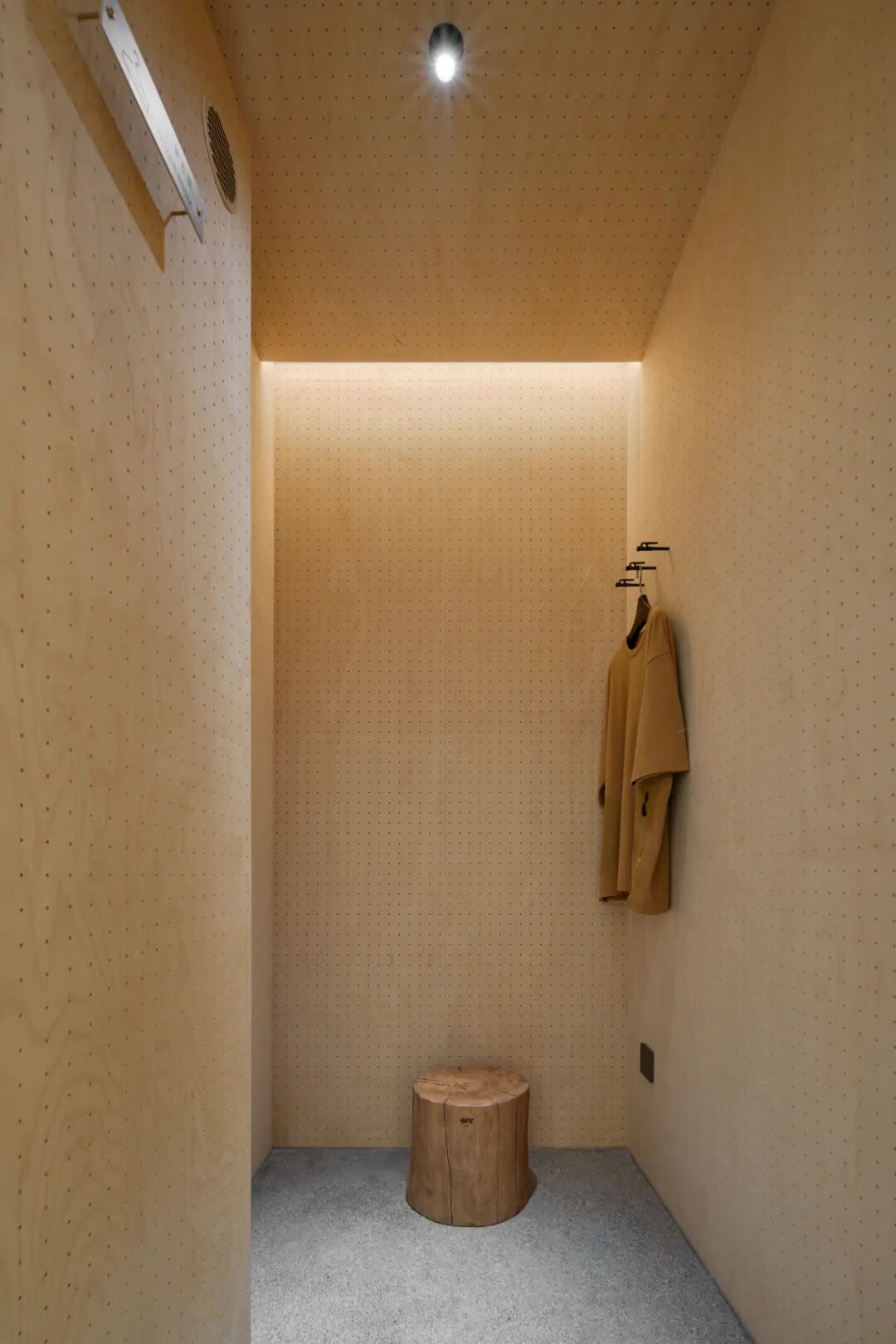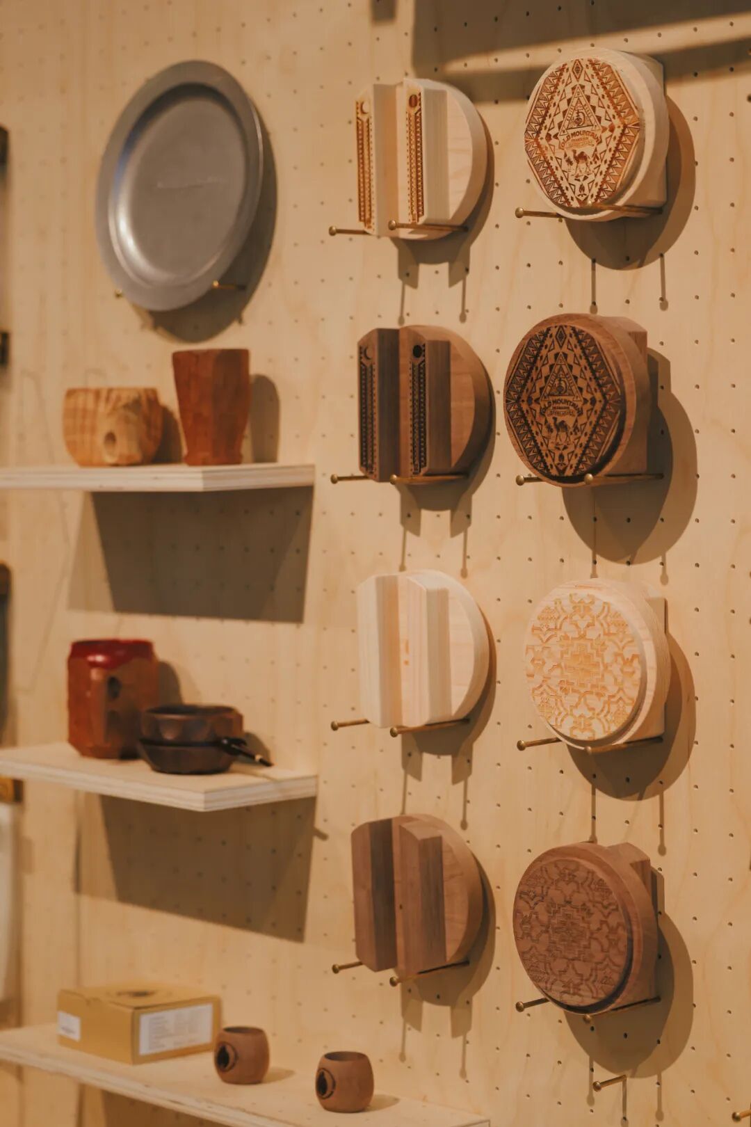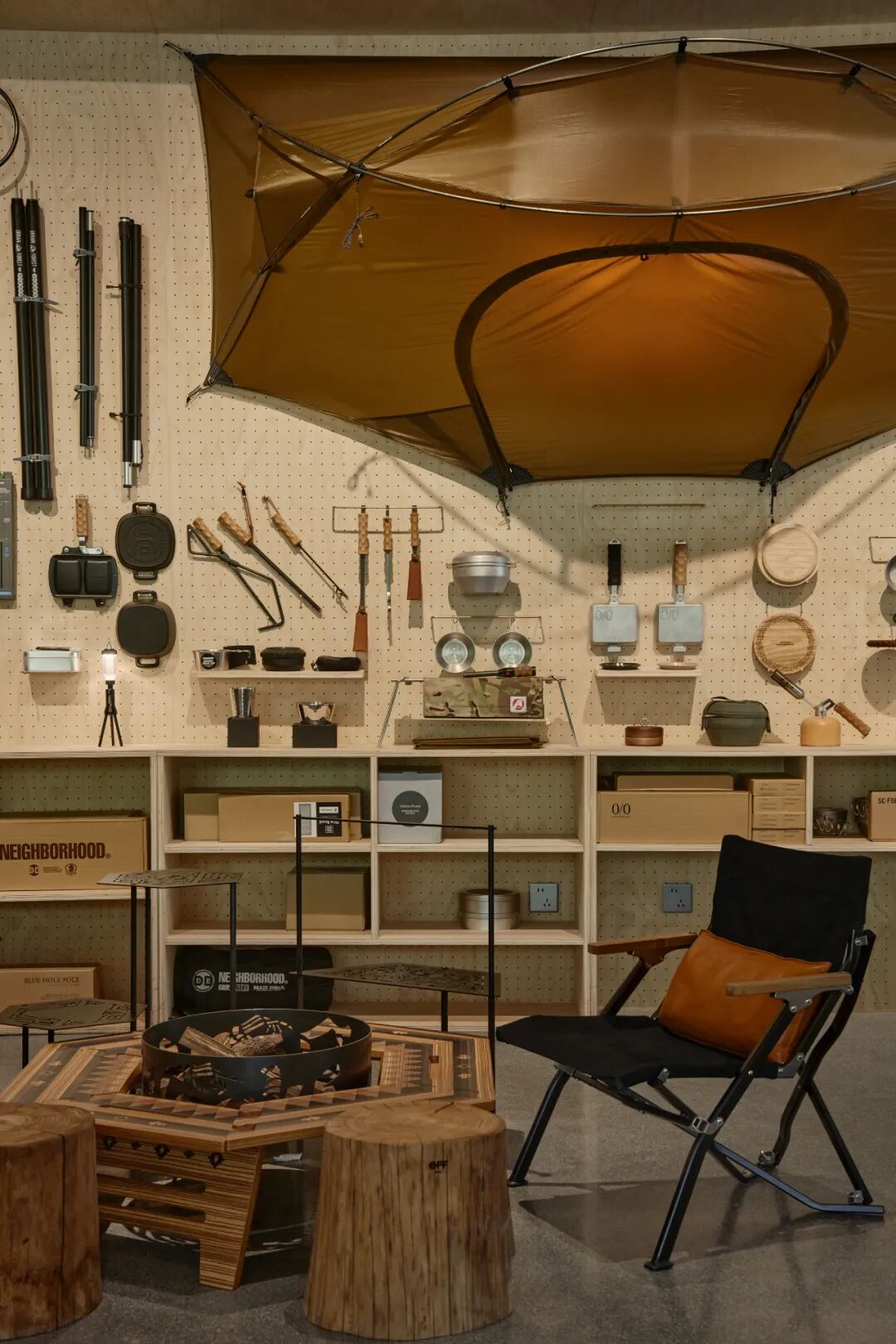 露营产品大到帐篷天幕,小到地钉勺子,多样性强,形式规格多变,货品上新速度快,需要一种灵活的陈列模式,OFF店里运用了木质洞洞板,并将此延伸为空间主元素与主色调。