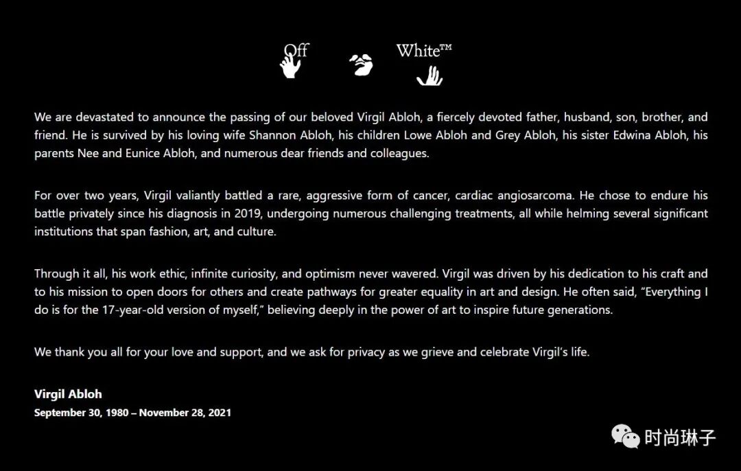 Off-White 创始人兼Louis Vuitton路易威登男装艺术总监 Virgil Abloh 于近日在洛杉矶因病去世,享年41岁。