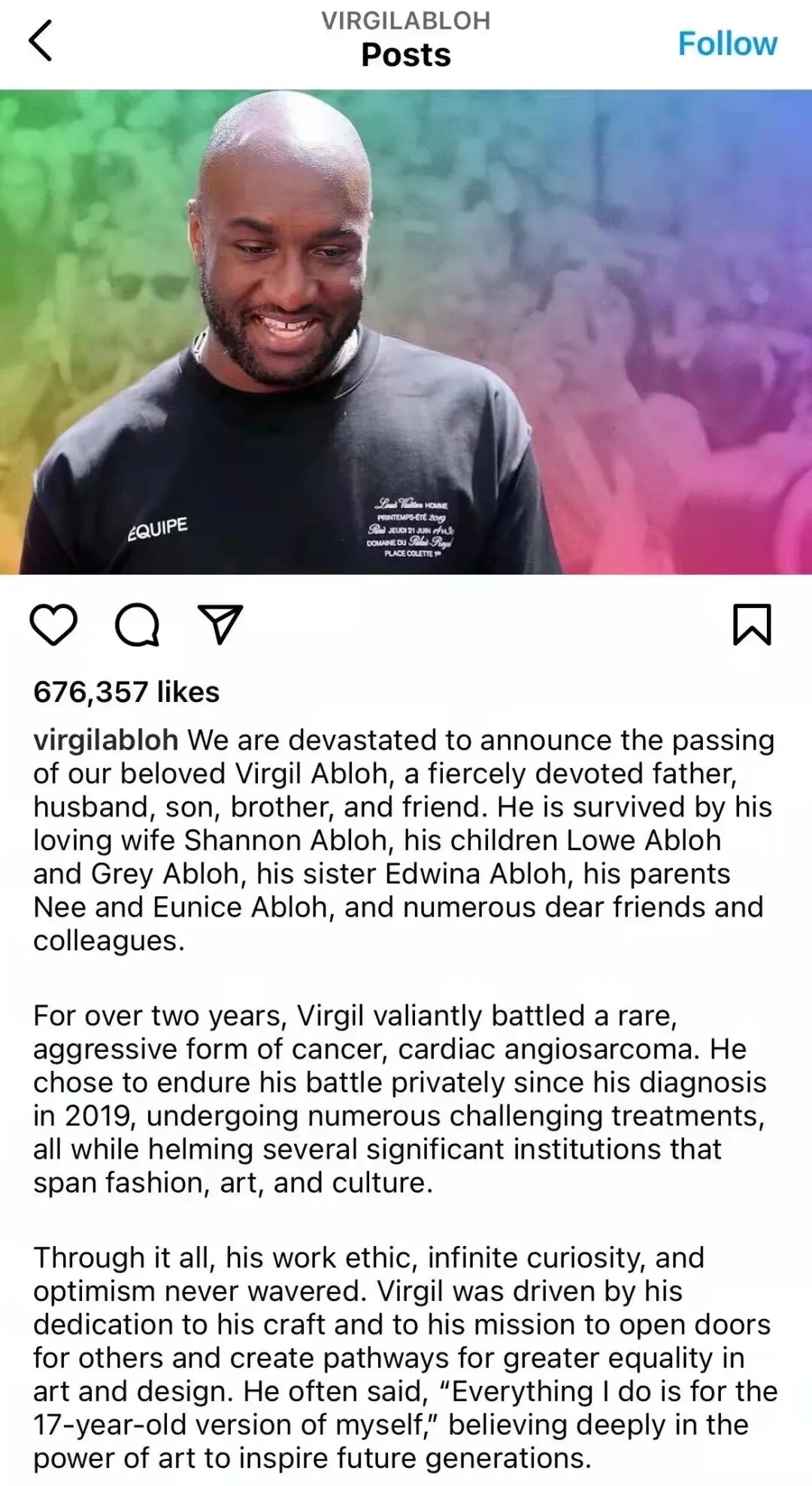 2021年即将进入尾声,而今天更是2021年时尚圈最为悲痛的一天 。著名设计师、Louis Vuitton男装艺术总监、Off-White创始人Virgil Abloh在和癌症秘密抗争两年后, 于11月28日离世,对于时尚圈来说,无疑是巨大的一个遗憾。
