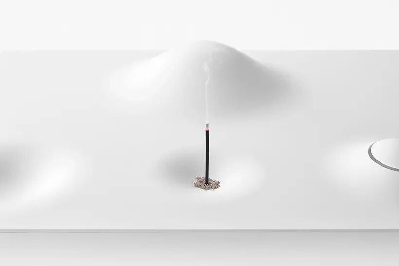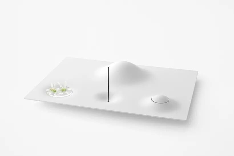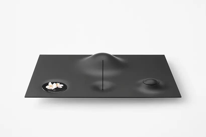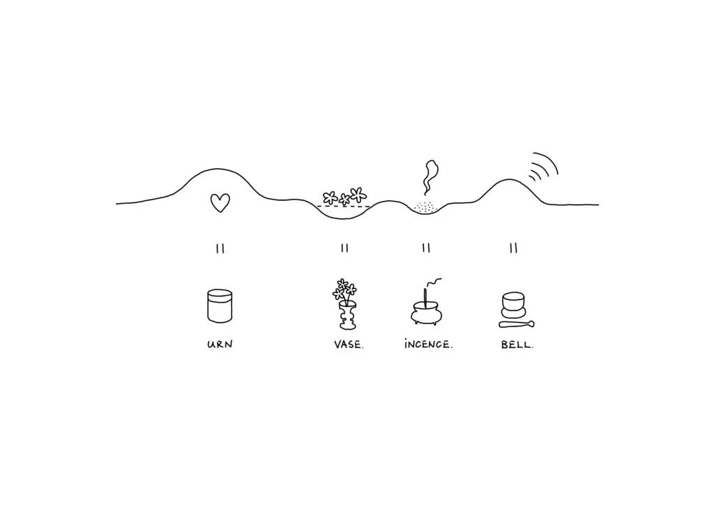 所讨论的佛坛就是在这样的背景下设计的。祭坛由四部分组成——瓮、香炉、花瓶和钟——巧妙地将这四部分的角色整合到一个景观中,而不仅仅是提供一个放置配件的托盘。瓮隐藏在一座小山下,用水填满景观中的洼地,将其变成一个湖泊,或一个盛放鲜花的花瓶。香柱可以直立使用,也可以侧放使用,其中的小空心用作燃烧器以接住灰烬。最后,钟声也是祭坛的山丘和山谷之一,用手一按,就会从里面响起。还设计了一个挂件,用来挂在脖子上的少量骨灰。吊坠实际上是从它的支架上切掉的一部分,后者像瓮一样呈山形。愿它的佩戴者感觉好像他们靠近那片风景中休息的人。