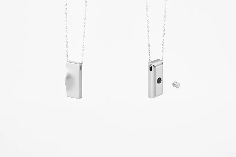 It is against such a backdrop that the Buddhist altar in question was designed. Comprising four parts—urn, incense burner, vase, and bell—the altar subtly integrates the roles of all four into one landscape, rather than merely providing a tray on which to place the accessories. The urn is hidden beneath a small hill, and filling the dip in the landscape with water turns it into a lake, or a vase to hold flowers. An incense stick may be used either upright or on its side, with the small hollow serving as a burner to catch its ashes. Finally, the bell too is one of the altar’s hills and dales, ringing from within at the touch of a hand. A pendant to house a small amount of ashes to wear around the neck was also designed. The pendant is actually a section cut away from its holder, the latter hill-shaped like the urn. May its wearer feel as though they stay close to the one who rests in that landscape.