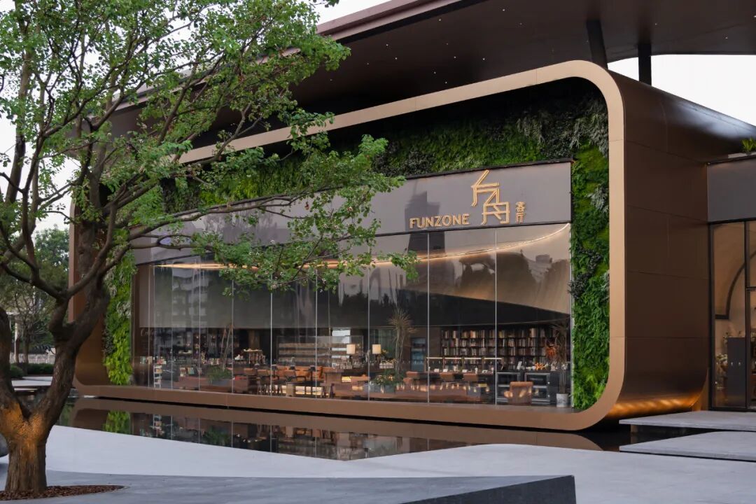 开敞的静水面倒映着橱窗里美好的社区生活。