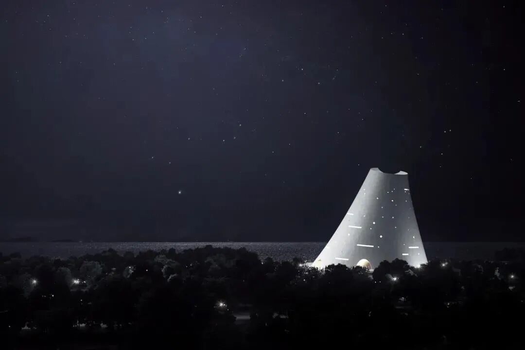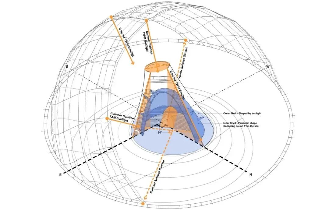 塔的几何形态被时光雕刻而成,仿佛一个大型日晷,其曲面结构神奇地被阳光切开,将内部开放给壮阔的大海。建筑坐落在一个缓缓向场地中央下沉的广场内,呈组合壳体结构,内外两层白色混凝土壳体由水平的楼板和坡道连接支撑。