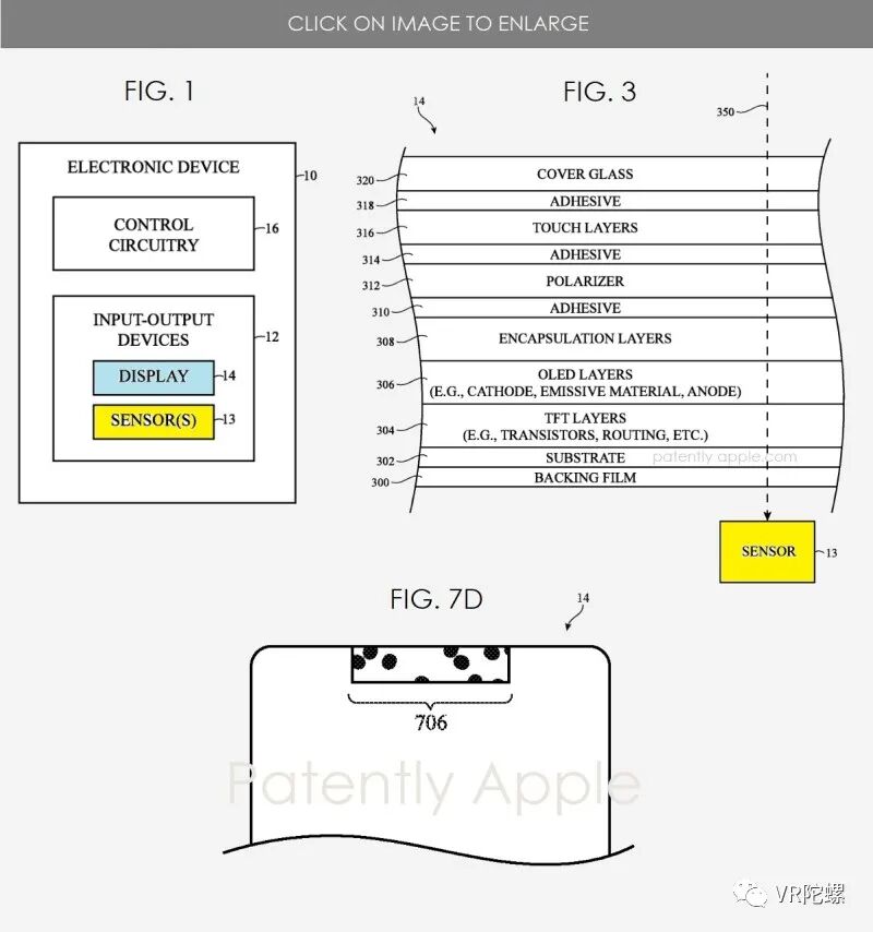 据苹果公司称,可包括显示器下传感器的设备包括Mac、iPad、iPhone、Apple Watch、未来的混合现实头显、智能眼镜、游戏设备、车辆中的系统等。