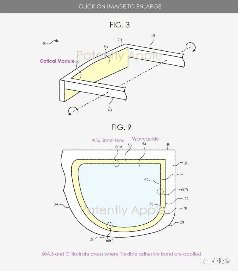 苹果公司的专利图9说明了波导#54可以在受到较小或没有负载的离散位置选择性地与相应的透镜(如内透镜#56)粘合。