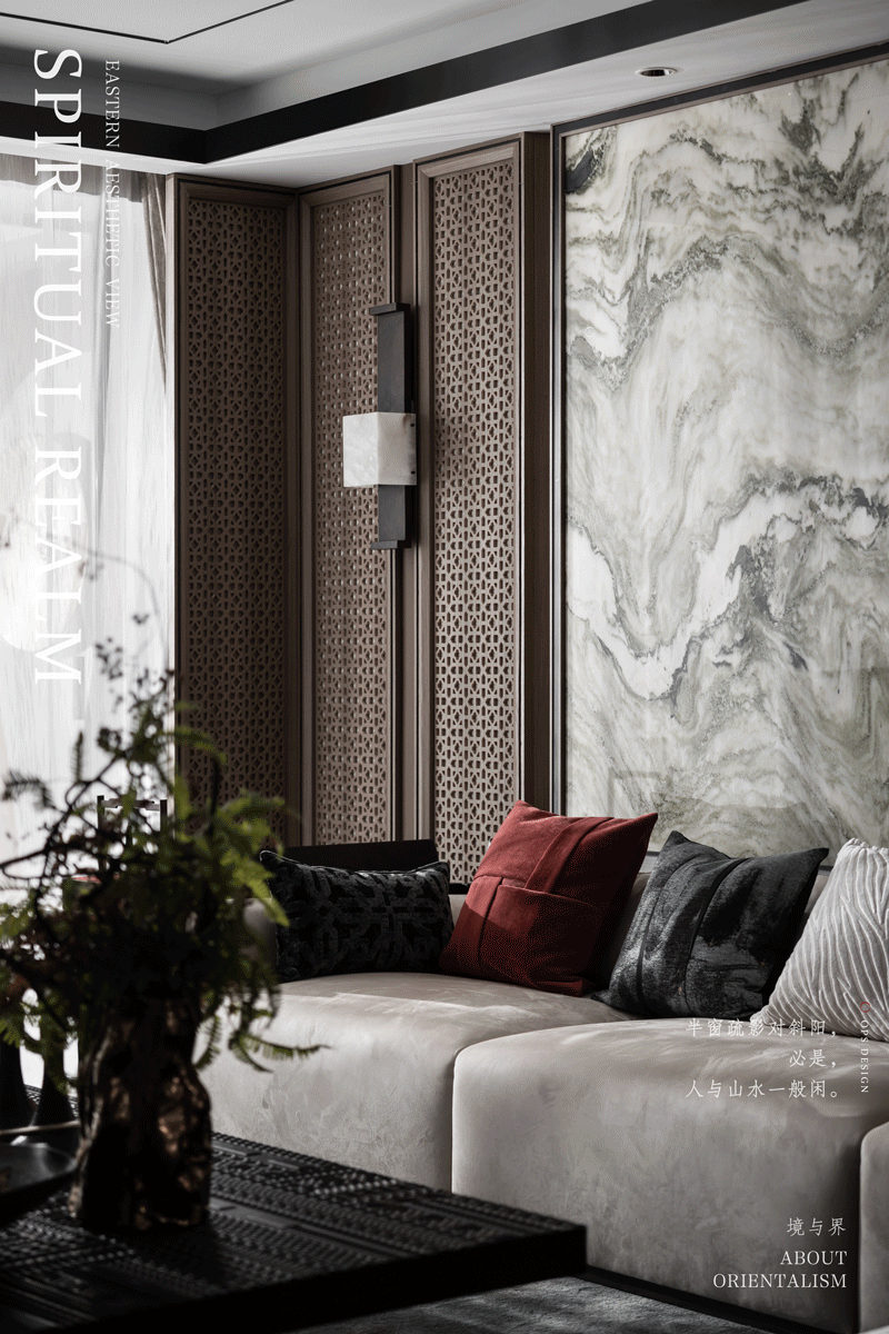 为了诠释「现代东方」自然写意、东方雅韵等特点,使用实木、棉麻布艺、天然大理石、金属等跨越古今的材质相结合铺叙东方气质的空间美学层次。
