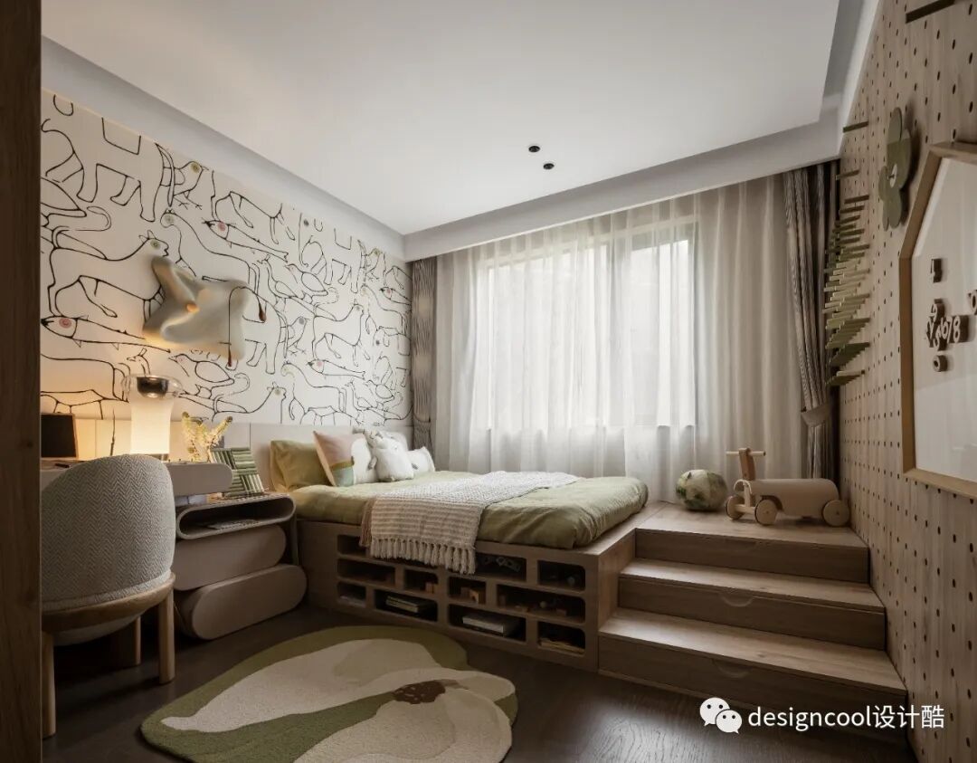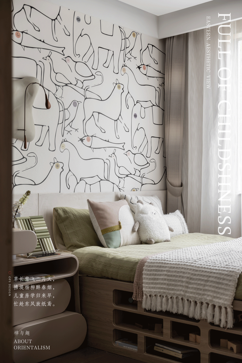 儿童房的设计在简约现代的风格基础上将东方经典元素提炼、蕴藏在各个细节之中,并运用明亮的色调与卡通元素,为孩童构筑具有趣味性的活动空间。