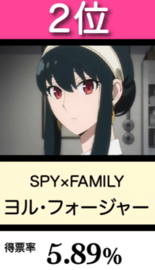 第二名是《间谍过家家》中的太太约尔,得票率是5.89%