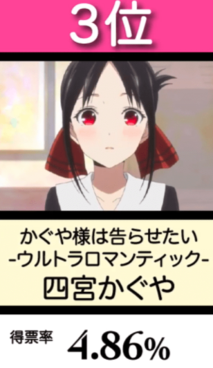 第三名是《辉夜大小姐想让我告白》中的四宫辉夜,得票率是4.86%