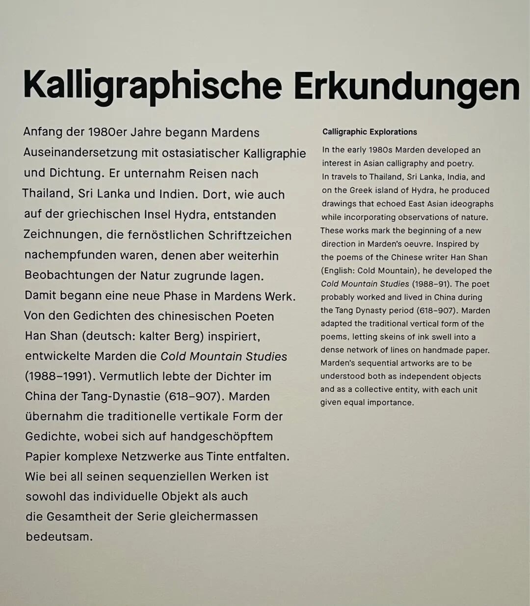 马登出现在 20 世纪 60 年代的单色绘画和图纸通知强烈的情感。他的艺术融合了现代主义绘画传统的两个基本立场:一方面是抽象表现主义的姿态特征;另一方面是对本质的还原,使他的工作至少在外观上与极简主义相似。在内部空间中,因此,博物馆展示了一系列与 1960 年巴塞尔艺术博物馆(巴塞尔市公共艺术收藏馆)之后的与美国艺术焦点有关的作品。
