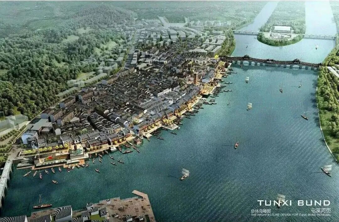*「屯浦归帆」的寓意深远:历史上的屯溪河街因坐落新安江上游北岸、成为微商贸易往来的中转站,随时代变迁、80年代的屯溪被拆迁建成滨江西路。屯溪河街新项目保古存旧、尝试创新,是真正意义上的「屯浦归帆」。