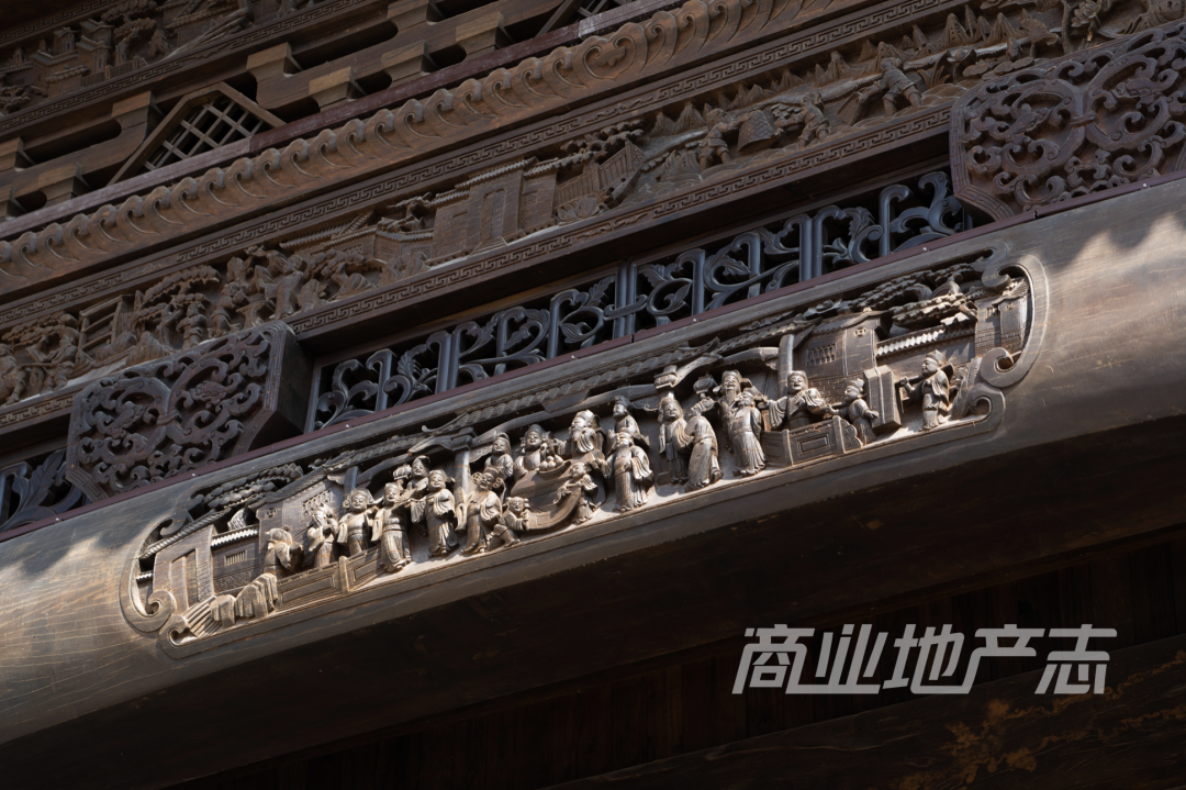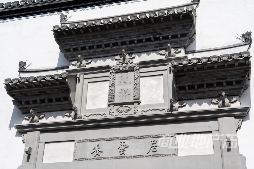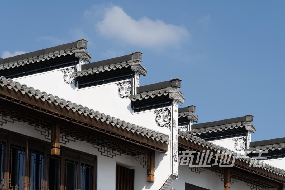 徽派建筑是这个项目的突出特色:白墙黑瓦和马头墙是最有代表性的建筑细节,石雕、木雕、砖雕古时多为家族财富象征。