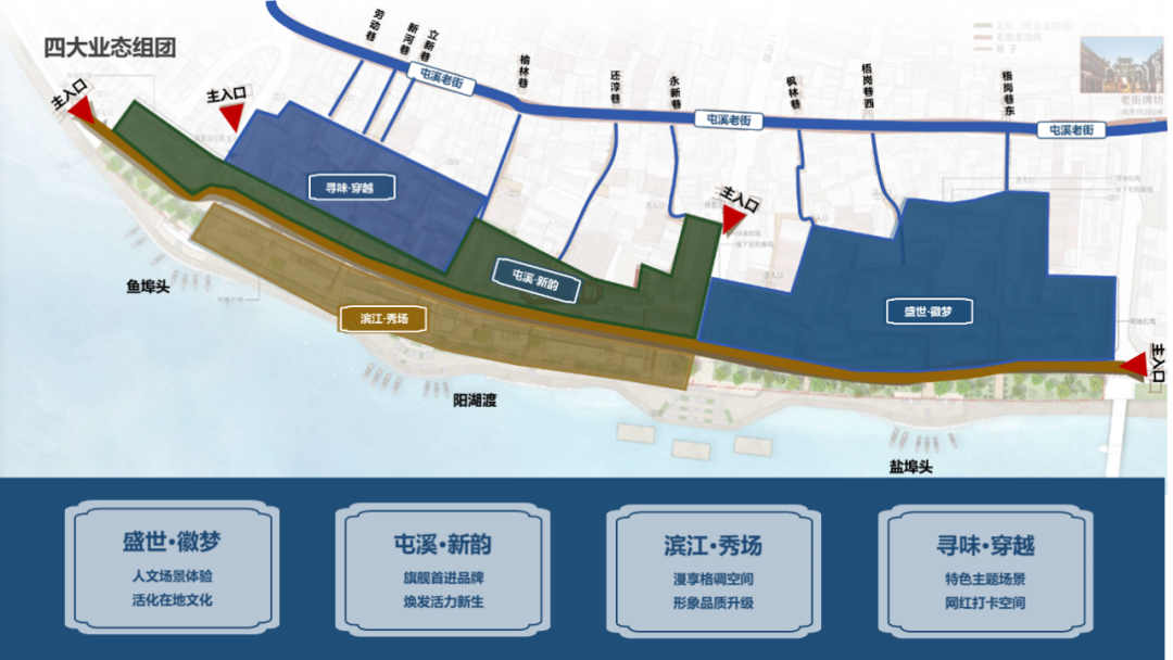 稍作了解后我发现,原来这三个紧密连接的板块之中的两个「屯溪」板块,是由黄山市政府的国有独资企业黄山文投集团投资统筹。其中焕然一新的「屯溪河街」,原来是「熟面孔」益田旅游商业在操盘。