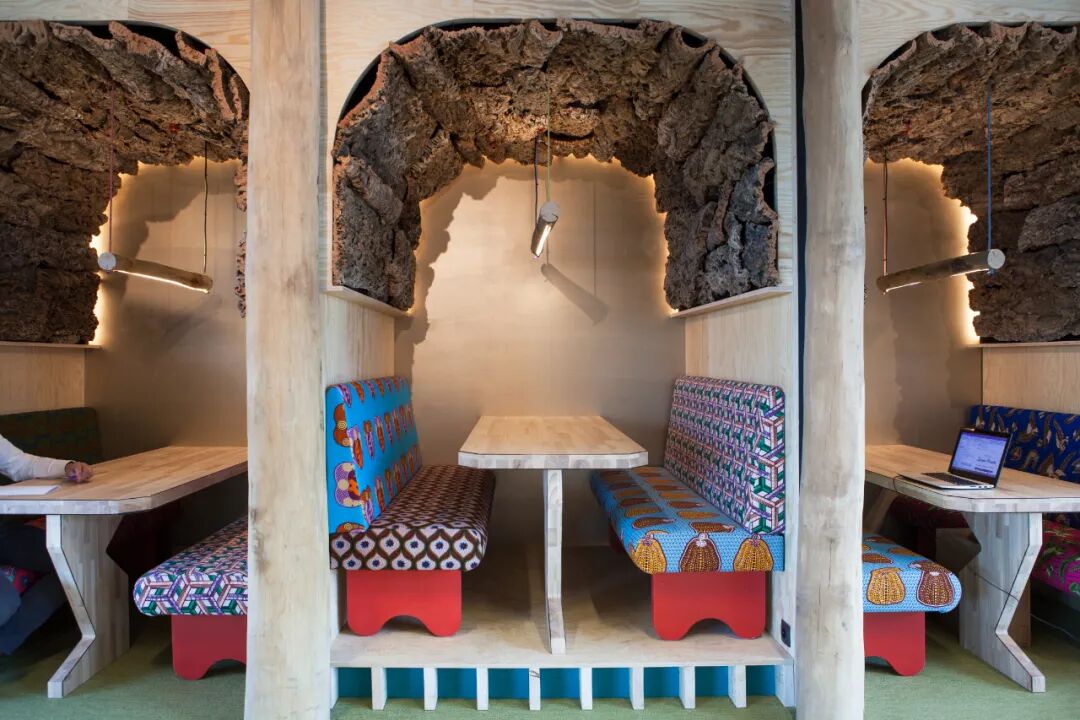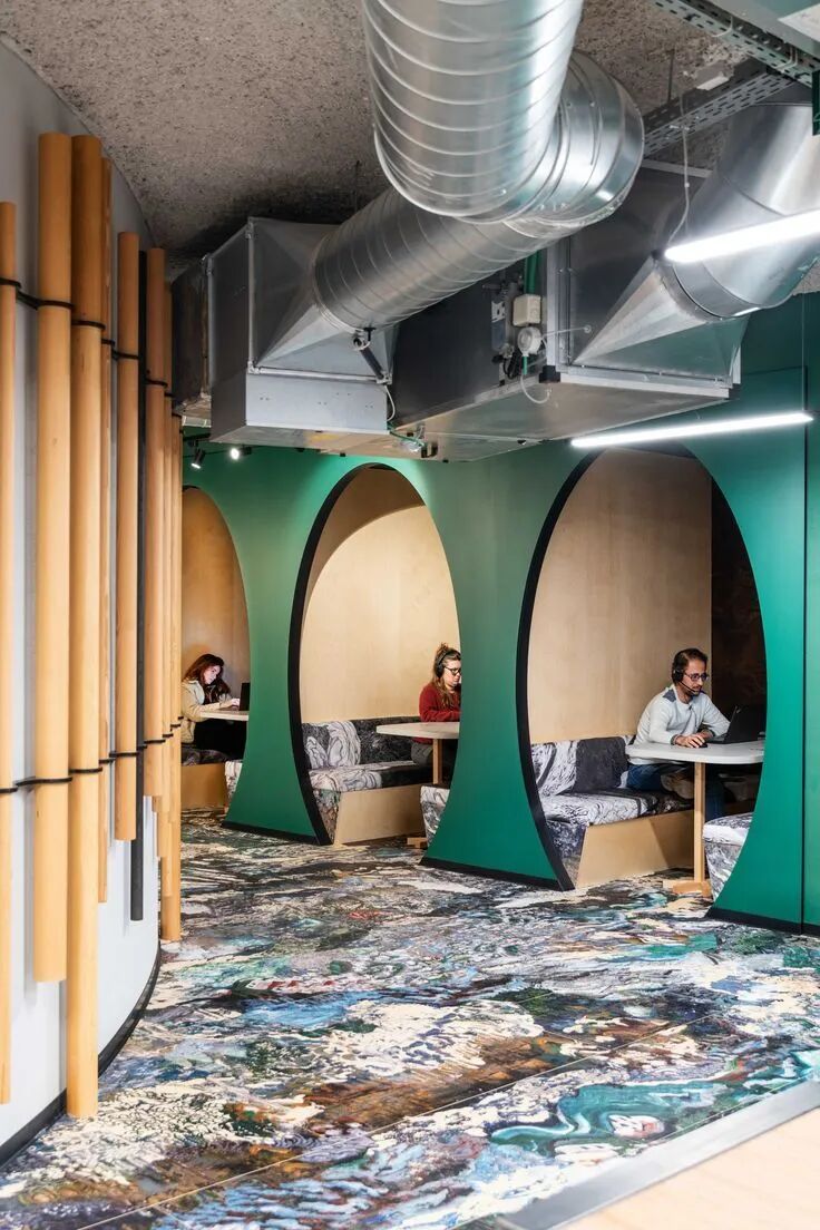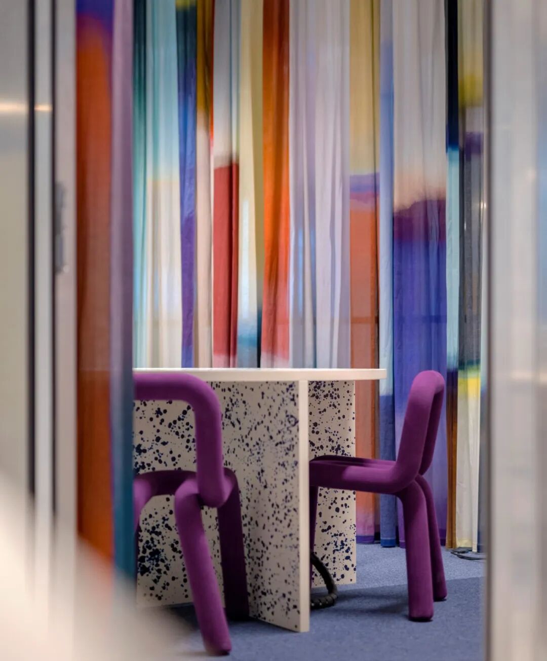 这些造型独特的家具让整个办公空间如同一个大型的艺术展览,充满了创意氛围。不仅在色彩上通过强烈的撞色反差营造出具有冲击感的视觉效果,在造型上也富有趣味。