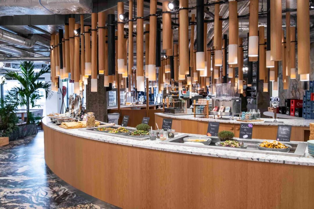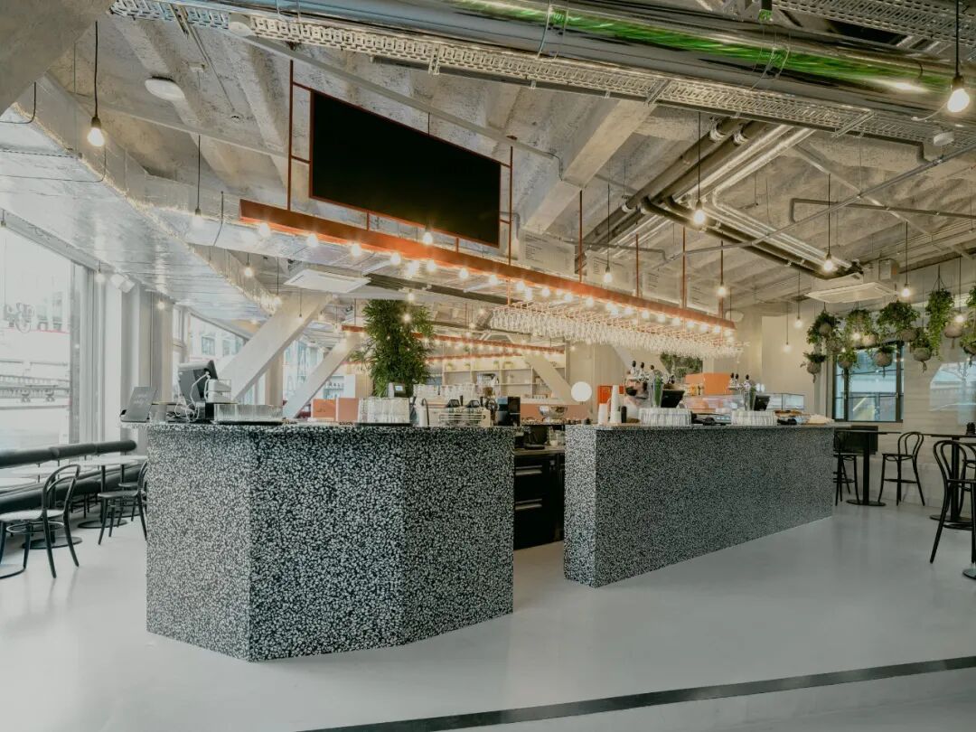 Silversquare Central 内还有一处与 Piovenefabi 合作设计的餐厅。水磨石吧台带有一点复古气息,并且独特的造型让整个视觉画面充满了层次感。