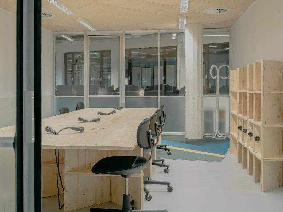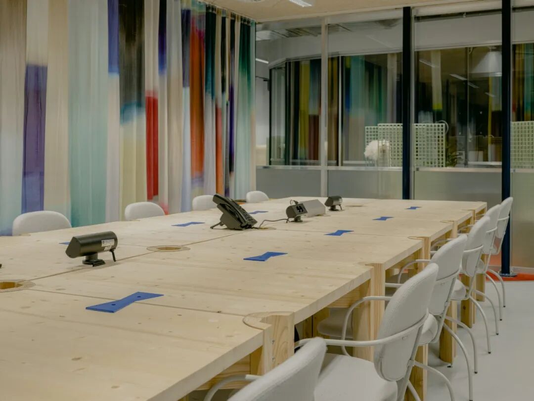 这些家具也都有丰富的细节,比如会议室的会议桌是由几张木头桌子拼接而成,而拼接处的蓝色组件成为了视觉上的亮点。