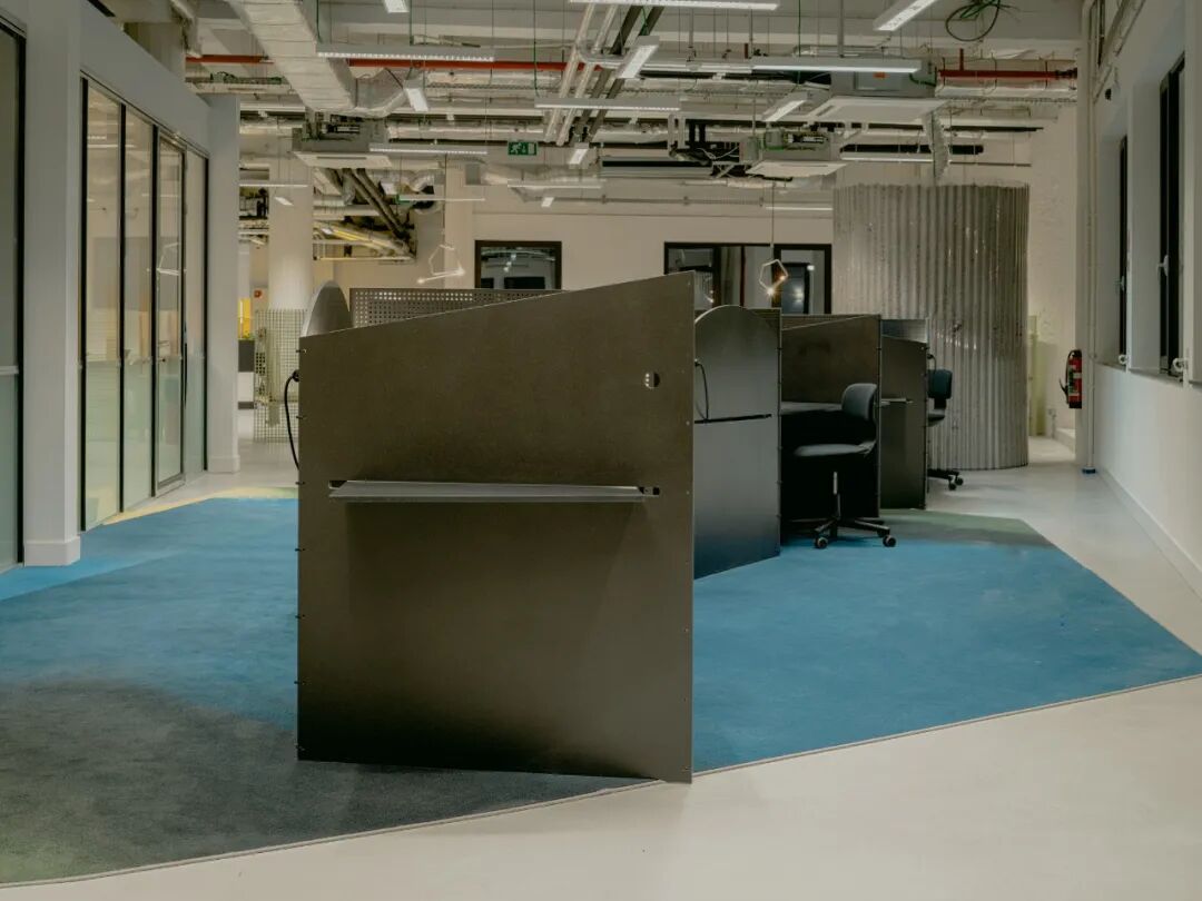 下方的格子间由建筑师 Maxime Prananto 设计,由 12 块完全相同的钢片组成,其营造出的冷峻氛围是空间中少有的,能让人更加专注;同时下方蓝色的不规则地毯又与其形成反差,创造出了艺术性和戏剧效果。
