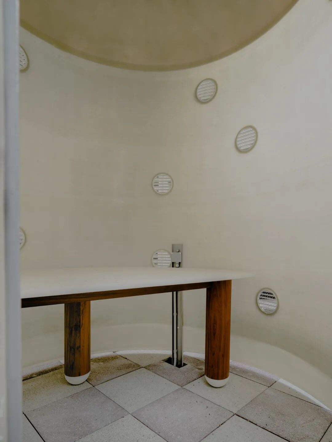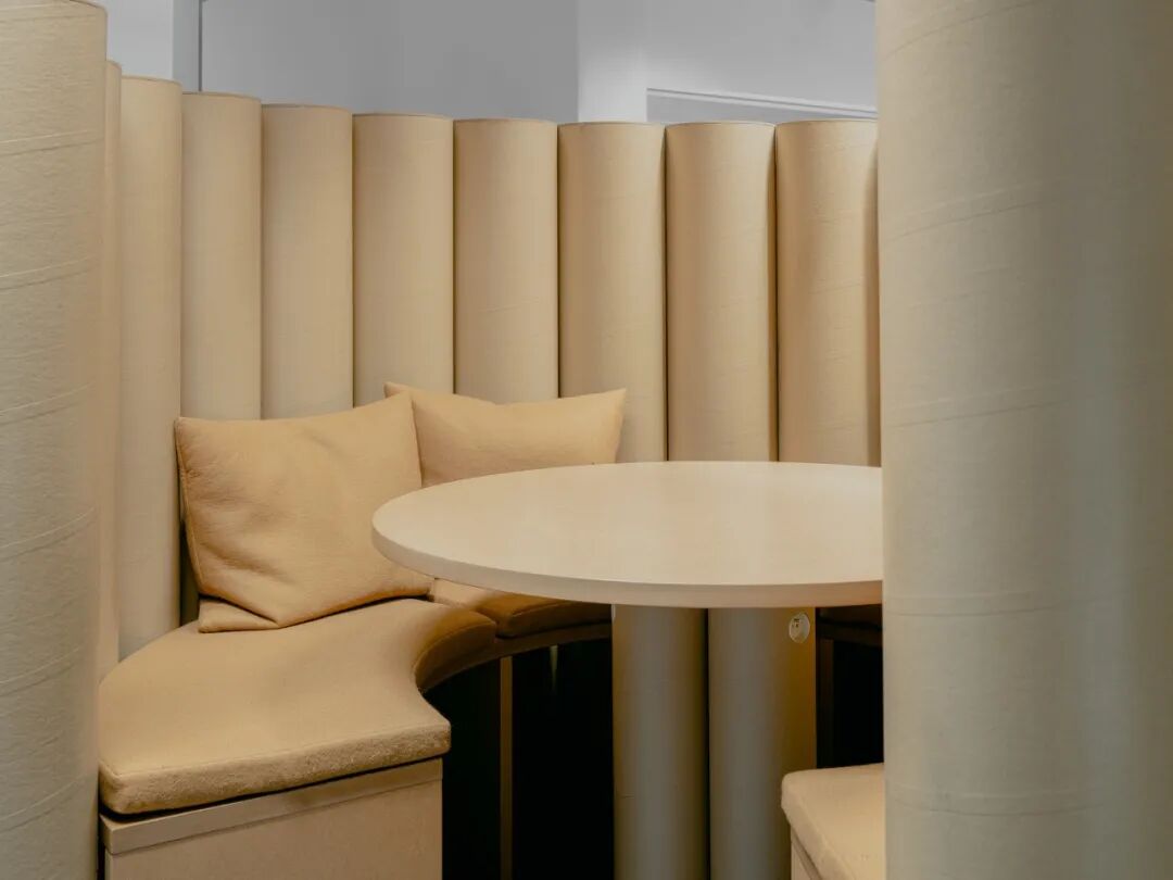 比如下方这个圆形座椅,外壳采用了温和的绒毛材质赋予一种温柔感,在开放空间当中给予了一点私密性以及仪式感。