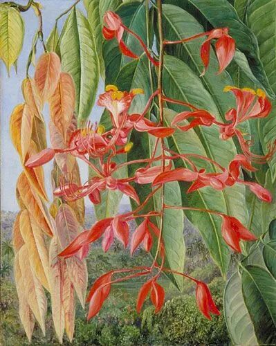 1856 年,26 岁的玛丽安娜·诺斯与父亲一起游览了位于伦敦西南角的邱园。当时的园长威廉·胡克(William Hooker)爵士送给她一束华贵璎珞木(Amherstia nobilis),这种植物被誉为“缅甸的骄傲”,它的异国情调和浓艳的色彩点燃了诺斯对植物和大自然的热情。