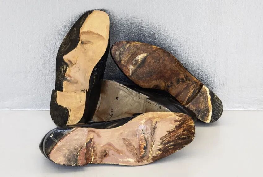 Installation - 16 pairs of black men's dress shoes, oil paint