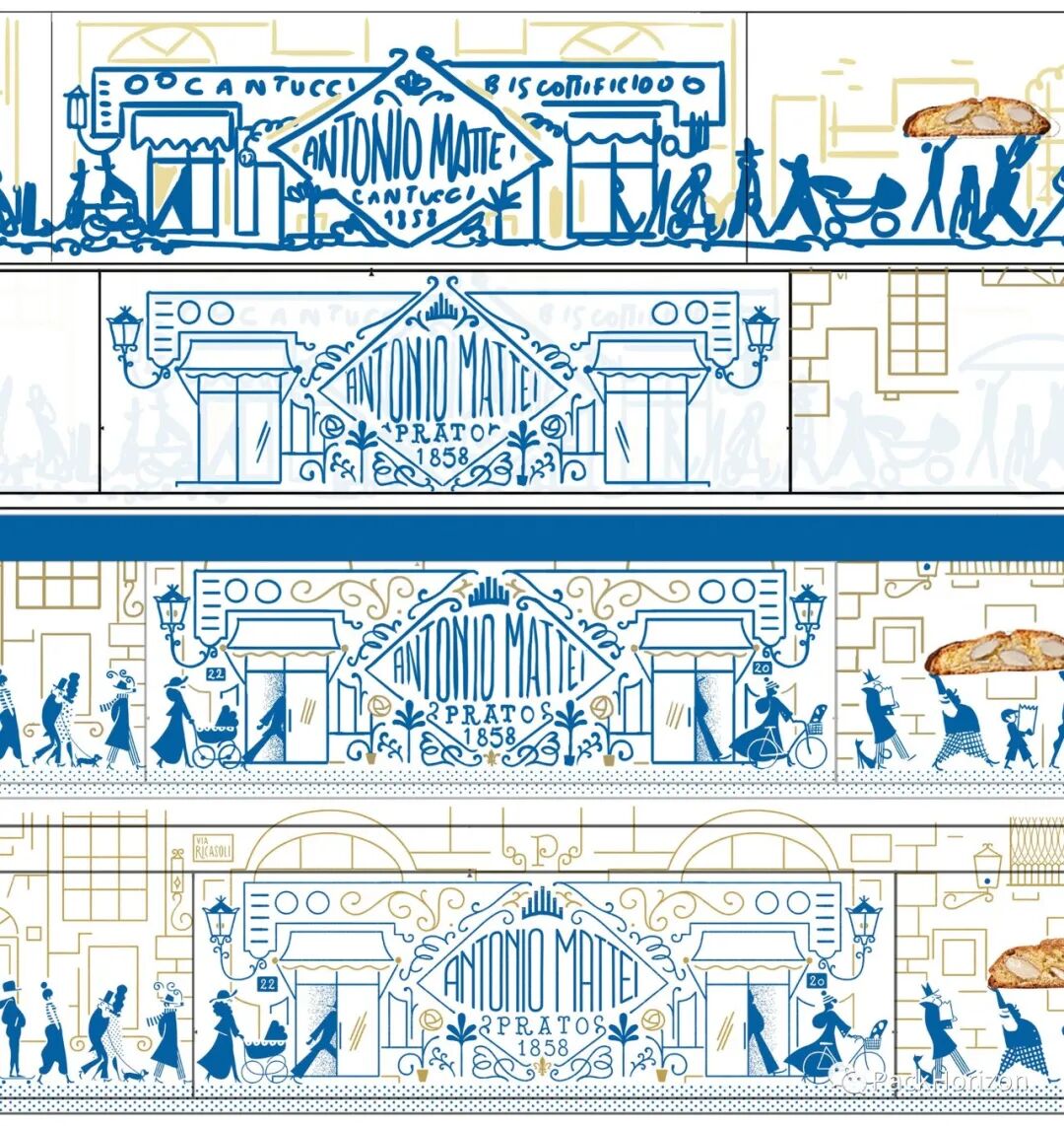 两个锡盒中的第一个要谈的是普拉托的这个历史悠久的家族企业的传统。该店早在1858年开业,至今仍拥有160多年前的位置和店面。我们的想法是创造一行人物,他们每天进入商店购物,然后带着他们的美味战利品离开。对我们来说,有趣的事情是混合跨越近两个世纪的文化和时尚。