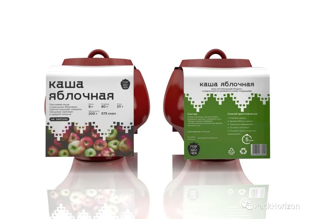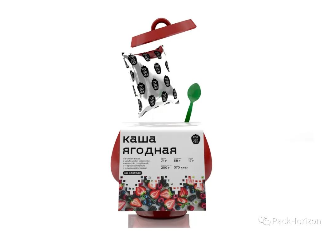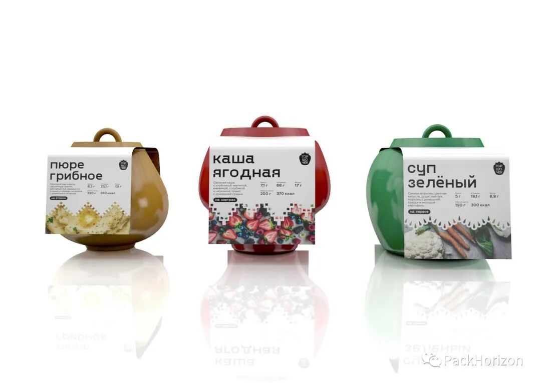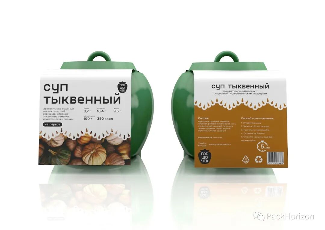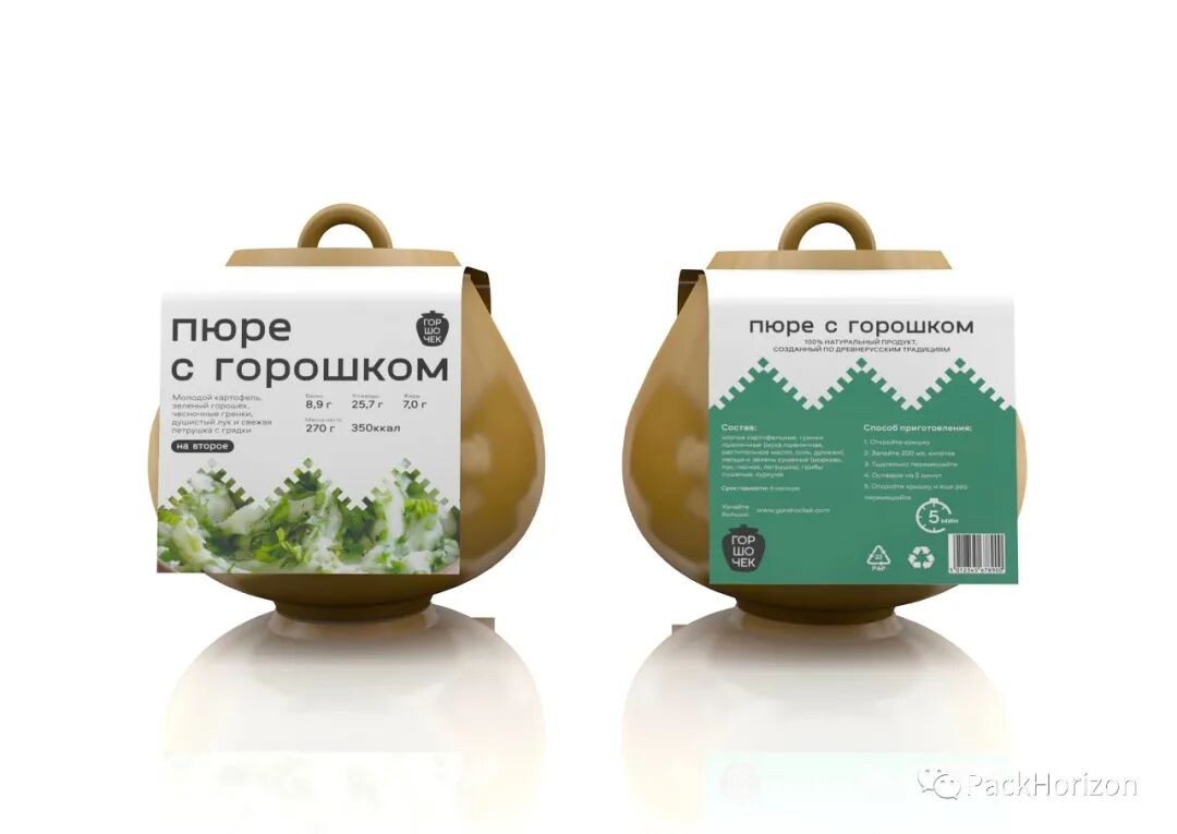 Горшочек(在俄语中意为“陶罐”)是现代健康方便食品品牌。为了传达这种自然和健康的理念,一个陶罐被作为包装的主要隐喻。这种对俄罗斯传统的引用有助于建立与温暖、舒适和自制食物的联系。该产品线包括 3 种产品,也涉及传统的俄罗斯美食。该系列包括汤、土豆泥和粥。它们都有各种口味。