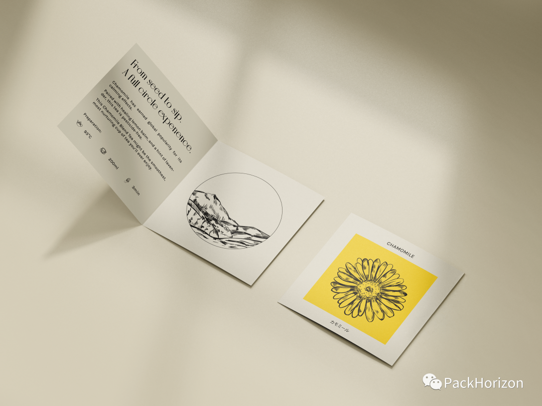 盒子中间有一个圆孔,里面有一张传单,上面有产品口味的综合图,里面有准备的指示。当我们取下传单并阅读准备指示时,我们看到了装有50克茶叶的金色容器产品。
