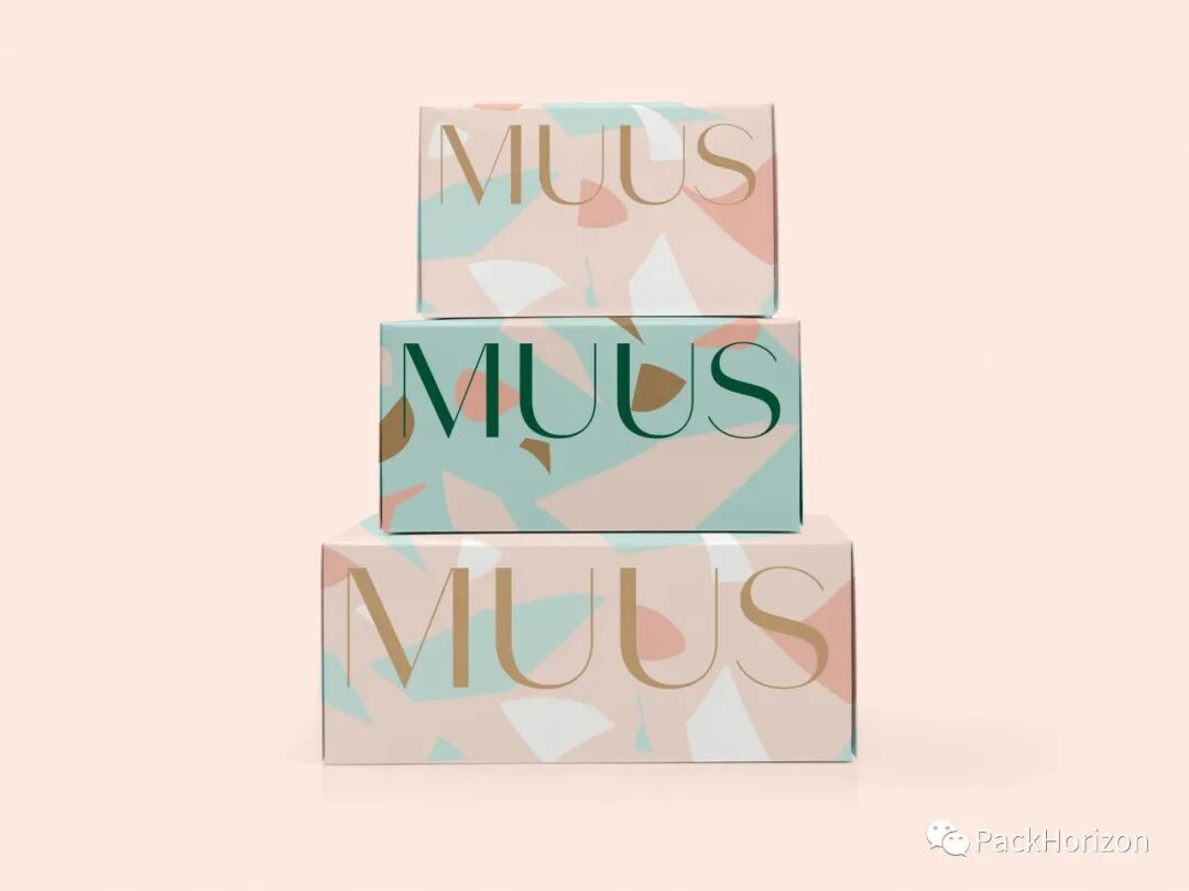 包装是 MUUS 品牌体验的关键元素,因为使用时间最长,也是最直接的。在设计时,我们考虑了视觉(美学)和触觉(纸质感)以及功能性(重量保持、打开方便、取出蛋糕)。